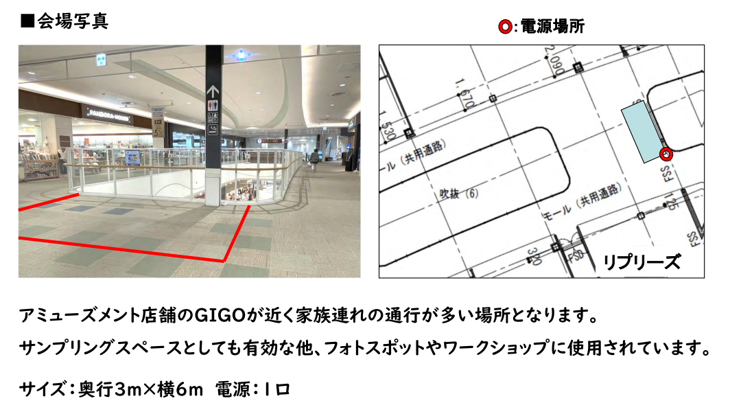 イベントスペースのご利用は、使用目的や企画内容による審査がございます。 事前に弊社担当者と打ち合わせ、審査に必要な資料等のご提出を必須としております。 内容および審査の結果によってイベントスペースのご利用をお断りする場合もございますので、予めご了承ください。 下記の使用目的・内容でのイベントスペースの使用は禁止といたします。 ・法律に違反するもの ・公序良俗に反する、またはわいせつなもの ・他人の信用または名誉・プライバシーを侵害するもの ・国内外の国家・民族等の尊厳を傷つける恐れのあるもの ・商標・著作権等を無断で使用するもの ・政治的または宗教的勧誘のあるもの ・当社の運営・利用を妨げるもの ・火気を使用するもの また、次の場合は使用許可を取り消す場合がございます。 ・使用目的・内容が禁止されているものに該当する場合 ・使用目的・内容等の変更に関して事前にお申し出のない場合 ・使用規定に違反のあった場合 ・使用上危険が予想されるとみなした場合 ・偽りの申請、その他不正手段により使用許可を受けた事実が明らかになった場合 ・使用の権利を譲渡、転貸した場合 ・その他管理上、支障または不適当と認められた場合 ・イベントスペースの使用目的に反した場合 上記がイベントスペースの使用中に発覚した場合、イベント等の実施中であっても即中断、退店いただき、今後一切の開催をお断りする場合がございますのでご了承ください。 なお、使用許可の取消、使用中止に伴う損害等についてイオンモール株式会社は一切の責任を負いません。 掲載しております賃料、諸条件につきましては一例です。イベントスペースは現況優先となります。 詳細は弊社担当者との打ち合わせ時にご確認ください。 本施設での出店・広告出稿にかかわる契約はイオンリテール株式会社と締結いただきます。