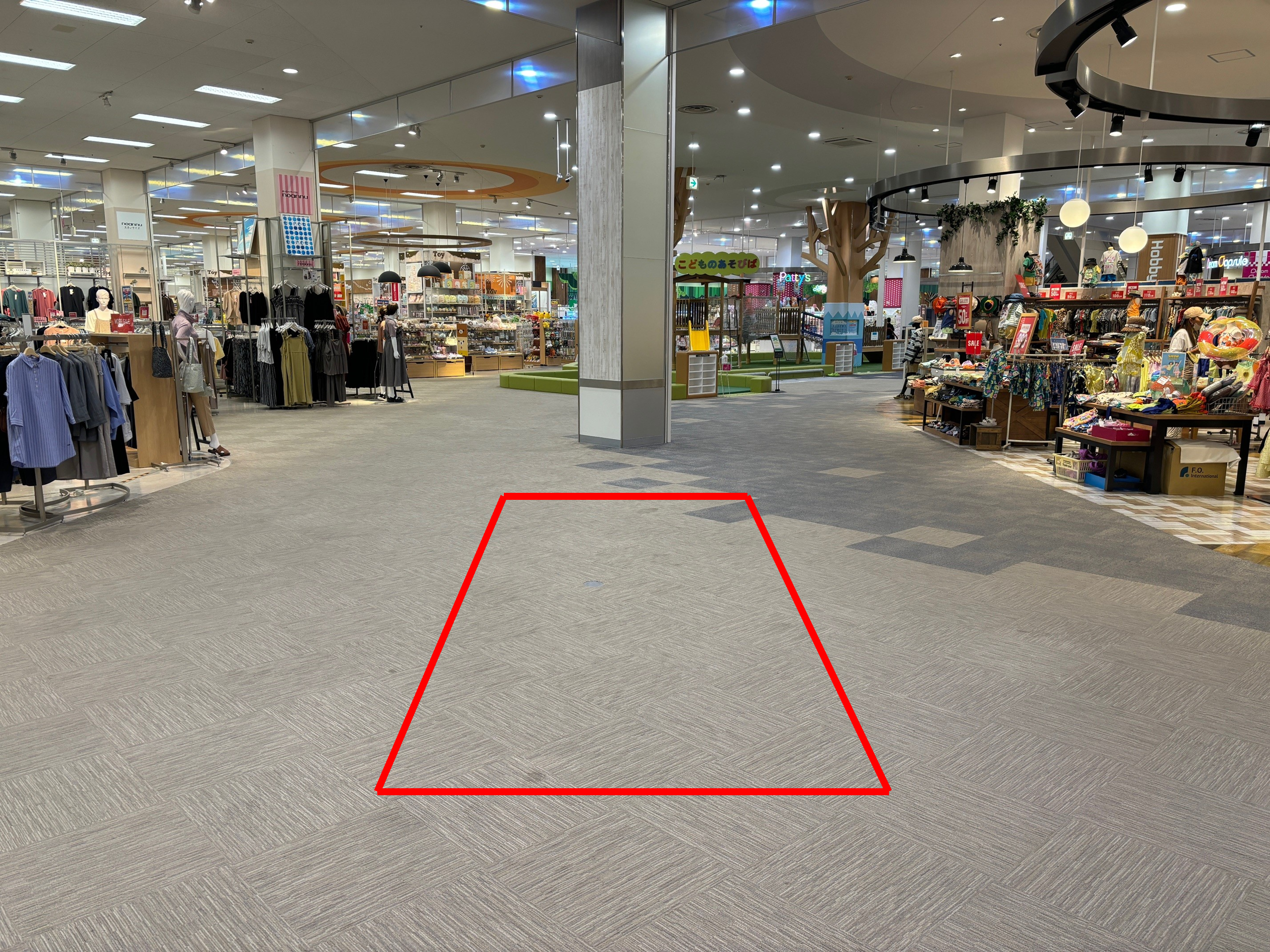 2Fのこどものあそび場のすぐ隣で土日は大変にぎわいます。周りにはお子様向けテナントなどもありお子様連れの家族へ告知をしたいのであれば最適な区画です。 特徴 ・小スペース ・電源あり(100V)1口 ・最大使用電力(1,500W) ・面積 3.33坪(11m²)
