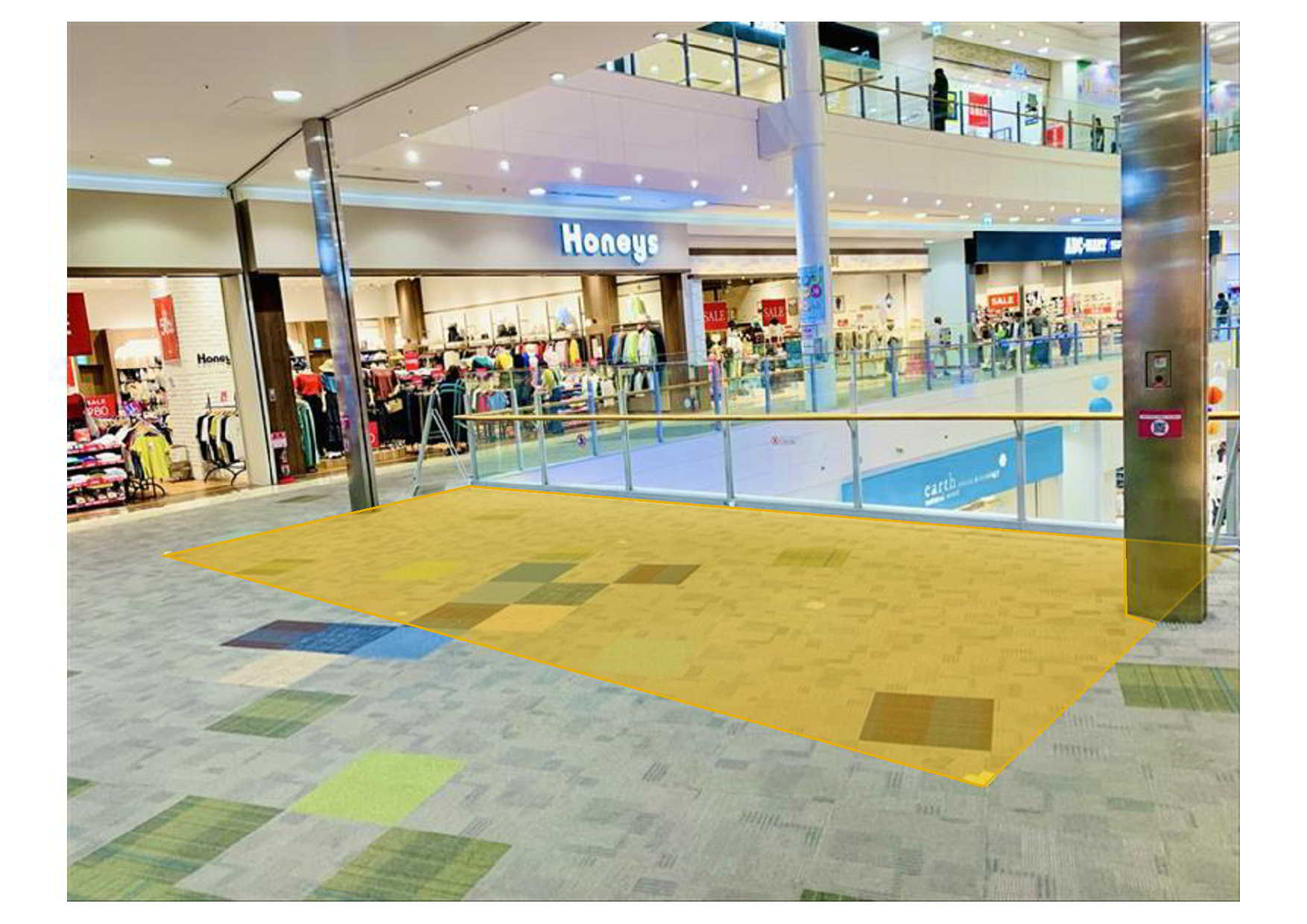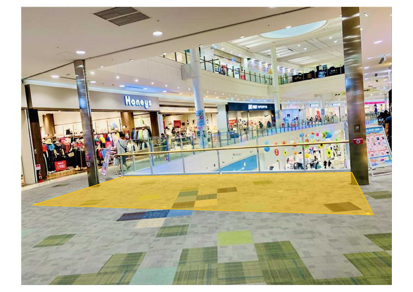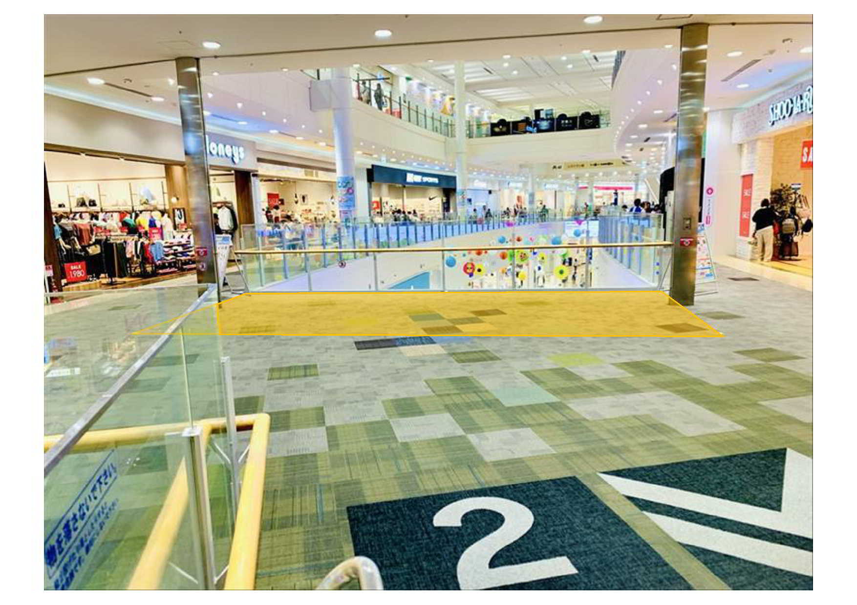 幅8000mm、奥行3500mm/28㎡(8.46坪)の区画です。 4階建て建物の2階フロアに位置する区画です。また、来館客数の多いイオンリテール(食品売り場)のエスカレータの上り口の真正面に位置し、1Fイオンリテール(食品売り場)とイオンモール専門店街の境目に在り、館外からのアクセス良く、お客さまの回遊率が高く賑やかな場所です。商品のPRやキャンペーン、物販催事等におすすめの区画です。