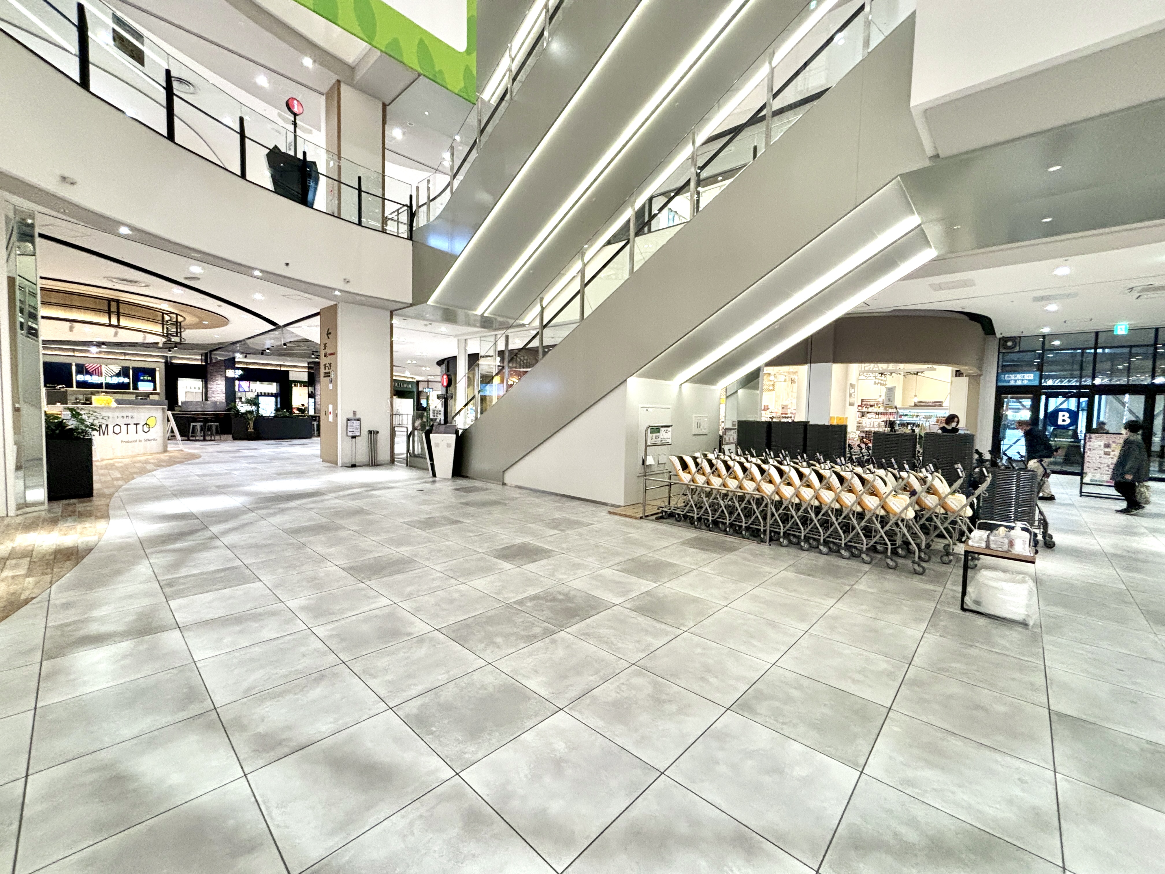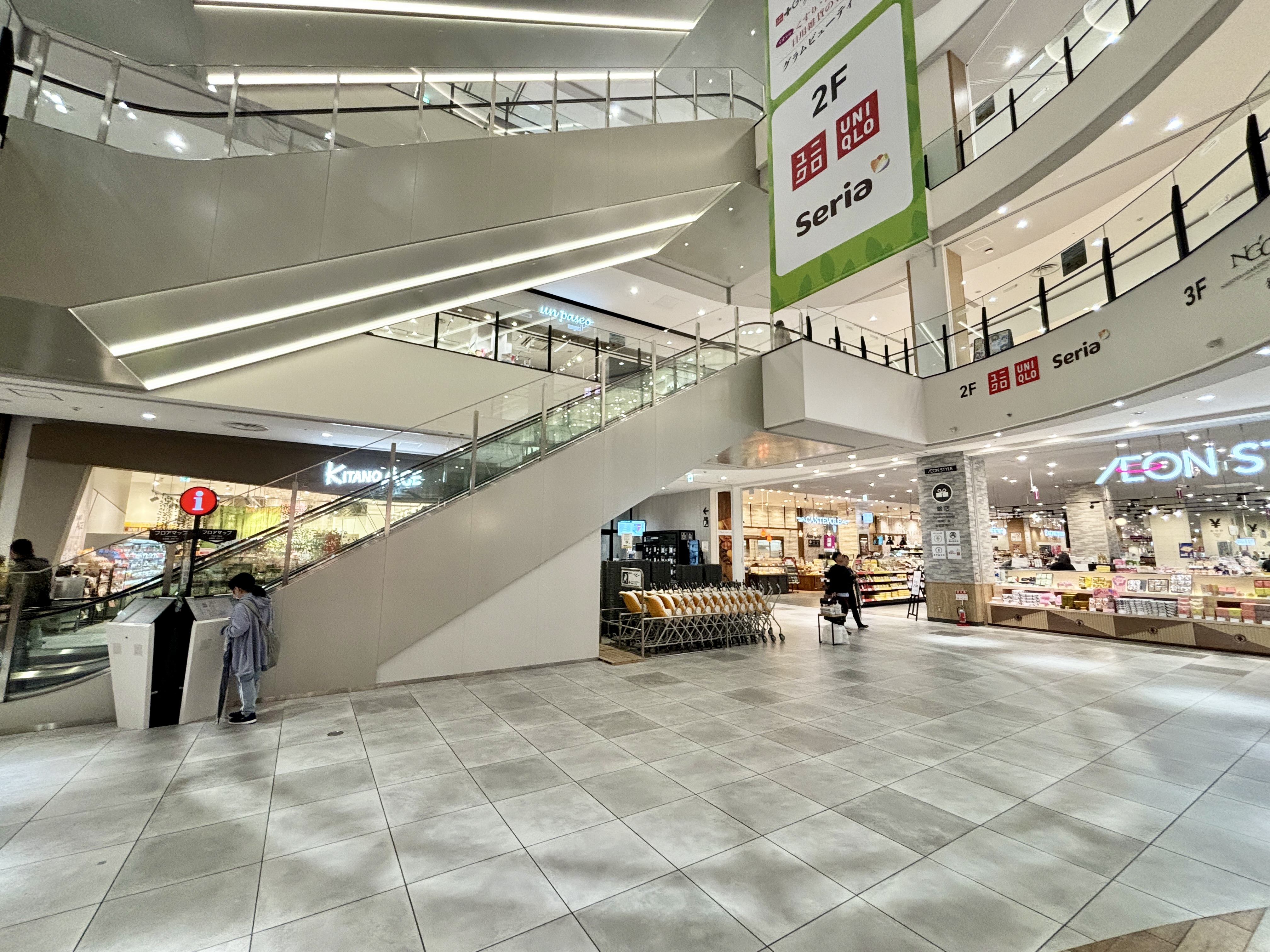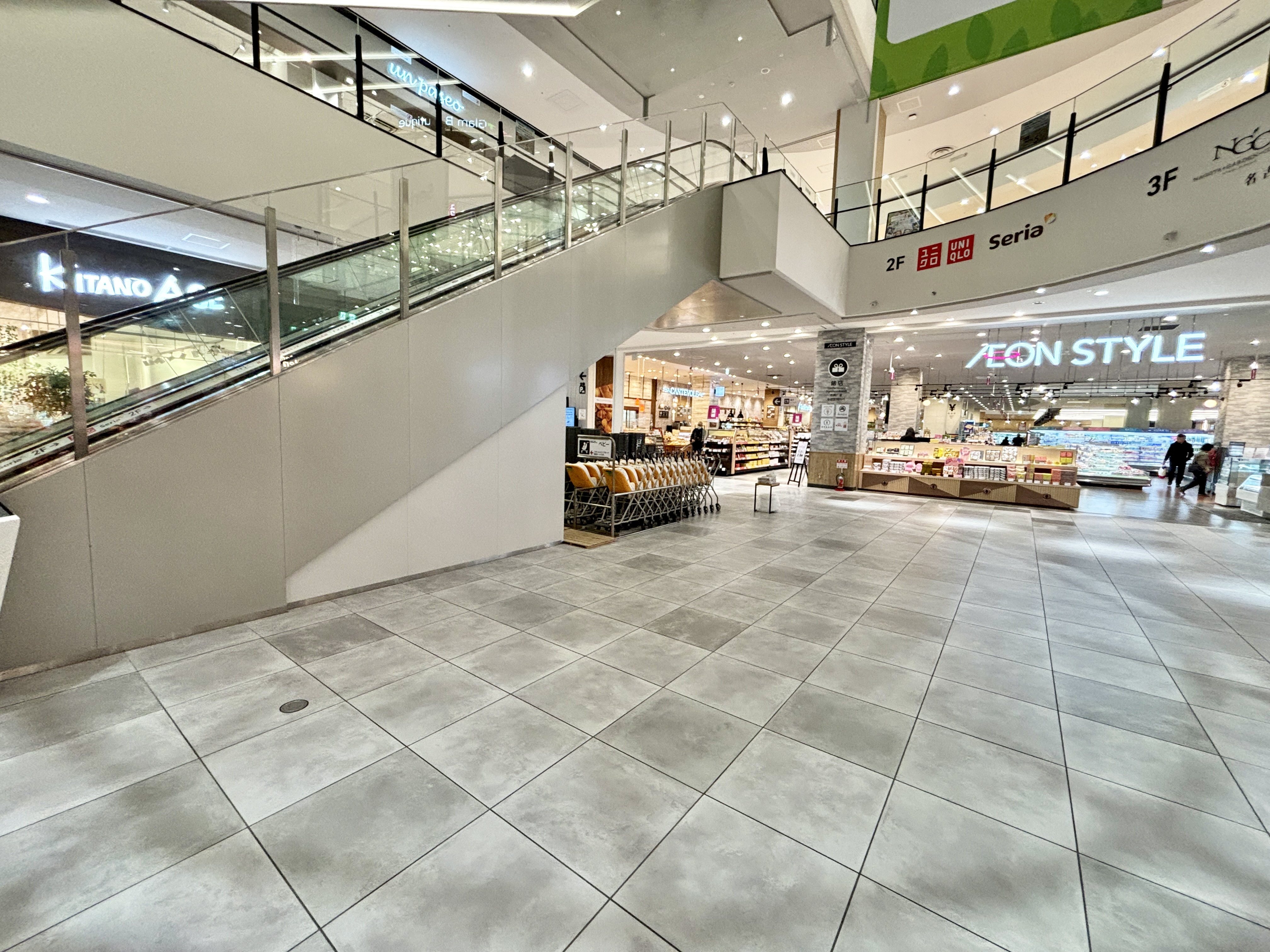 イオンスタイルに最も近い、交通量の多い会場です。食料品目当ての主婦層や、2 階直上にあるUNIQLO様目当てのファミリー等の通行が多く期待できます。 携帯キャリア様、ウォーターサーバー企業様、食物販催事、化粧品PRなど幅広い業種におすすめです。