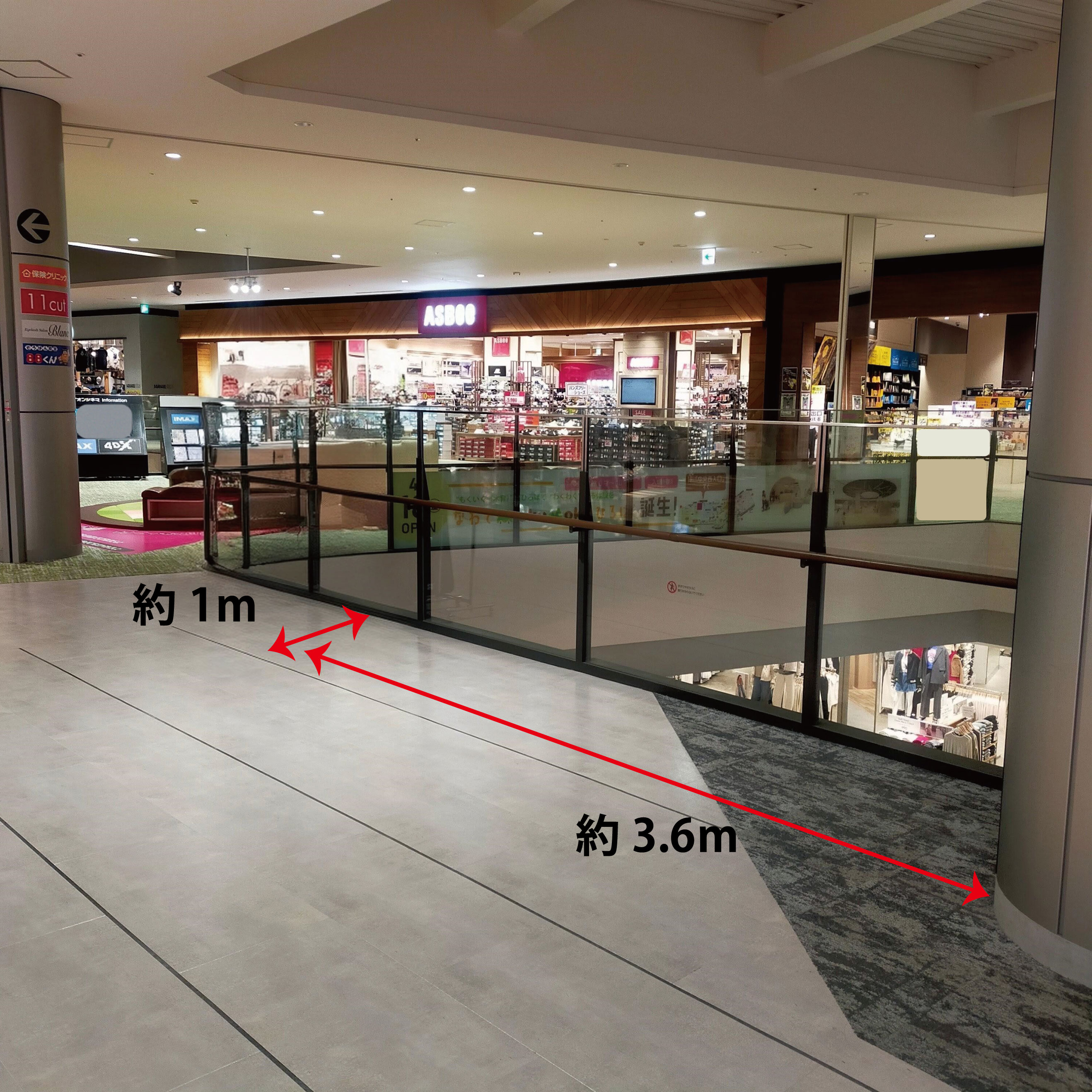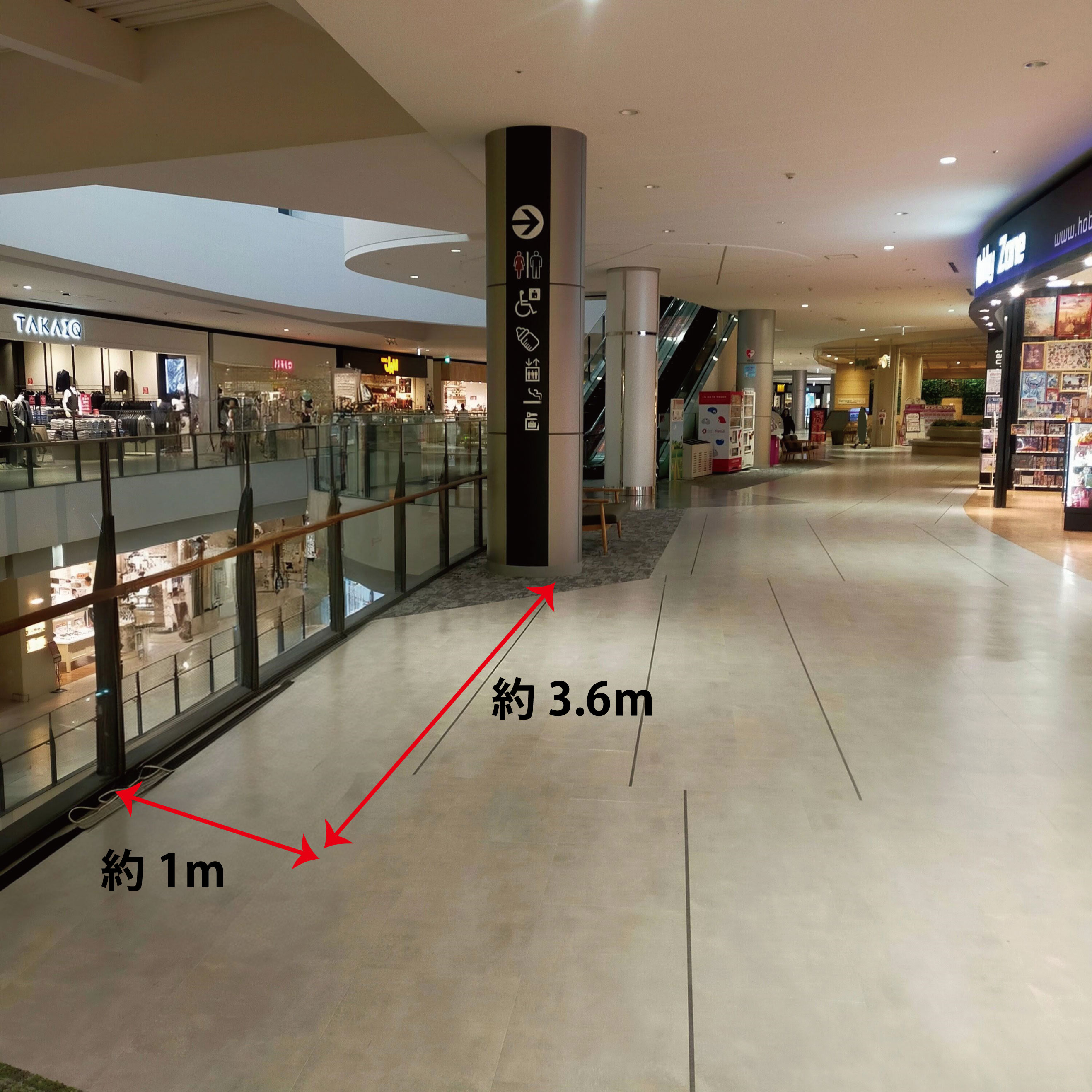 フードコートに隣接した通路になっております。 近くには小さなお子さまがご利用いただける子供の遊び場があり、多くのファミリー層中心に賑わう通行量の多いスペースです。 催事スペースの奥行が狭いため、簡易なPRイベントなどに適しています。 注意:奥行1.5m×幅6mほどになります。決められた範囲内でお願いいたします。