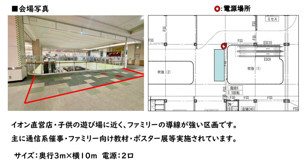イベントスペースのご利用は、使用目的や企画内容による審査がございます。 事前に弊社担当者と打ち合わせ、審査に必要な資料等のご提出を必須としております。 内容および審査の結果によってイベントスペースのご利用をお断りする場合もございますので、予めご了承ください。 下記の使用目的・内容でのイベントスペースの使用は禁止といたします。 ・法律に違反するもの ・公序良俗に反する、またはわいせつなもの ・他人の信用または名誉・プライバシーを侵害するもの ・国内外の国家・民族等の尊厳を傷つける恐れのあるもの ・商標・著作権等を無断で使用するもの ・政治的または宗教的勧誘のあるもの ・当社の運営・利用を妨げるもの ・火気を使用するもの また、次の場合は使用許可を取り消す場合がございます。 ・使用目的・内容が禁止されているものに該当する場合 ・使用目的・内容等の変更に関して事前にお申し出のない場合 ・使用規定に違反のあった場合 ・使用上危険が予想されるとみなした場合 ・偽りの申請、その他不正手段により使用許可を受けた事実が明らかになった場合 ・使用の権利を譲渡、転貸した場合 ・その他管理上、支障または不適当と認められた場合 ・イベントスペースの使用目的に反した場合 上記がイベントスペースの使用中に発覚した場合、イベント等の実施中であっても即中断、退店いただき、今後一切の開催をお断りする場合がございますのでご了承ください。 なお、使用許可の取消、使用中止に伴う損害等についてイオンモール株式会社は一切の責任を負いません。 掲載しております賃料、諸条件につきましては一例です。イベントスペースは現況優先となります。 詳細は弊社担当者との打ち合わせ時にご確認ください。 本施設での出店・広告出稿にかかわる契約はイオンリテール株式会社と締結いただきます。