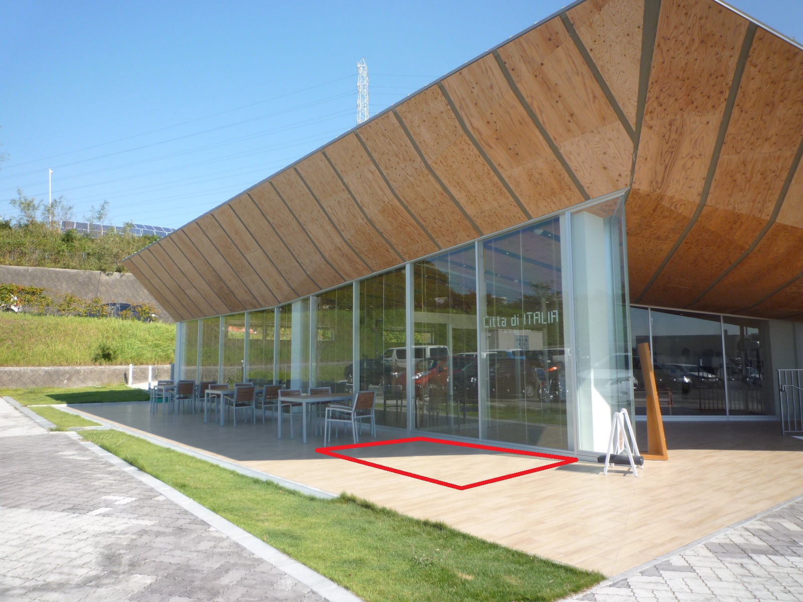 既設阿久比下りパーキングエリアの食堂横のデッキスペースです。PRイベントに利用可能です。お気軽にお問い合わせください。