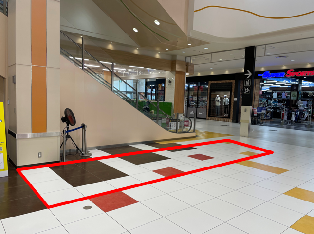 大型スポーツ専門店(スーパースポーツゼビオ)・ペットショップに隣接し、 小スペースですが着席型やサンプリングには有効なスペースです。 主に会員募集・ポスター等展示会・小型飲食催事などが実施されています。