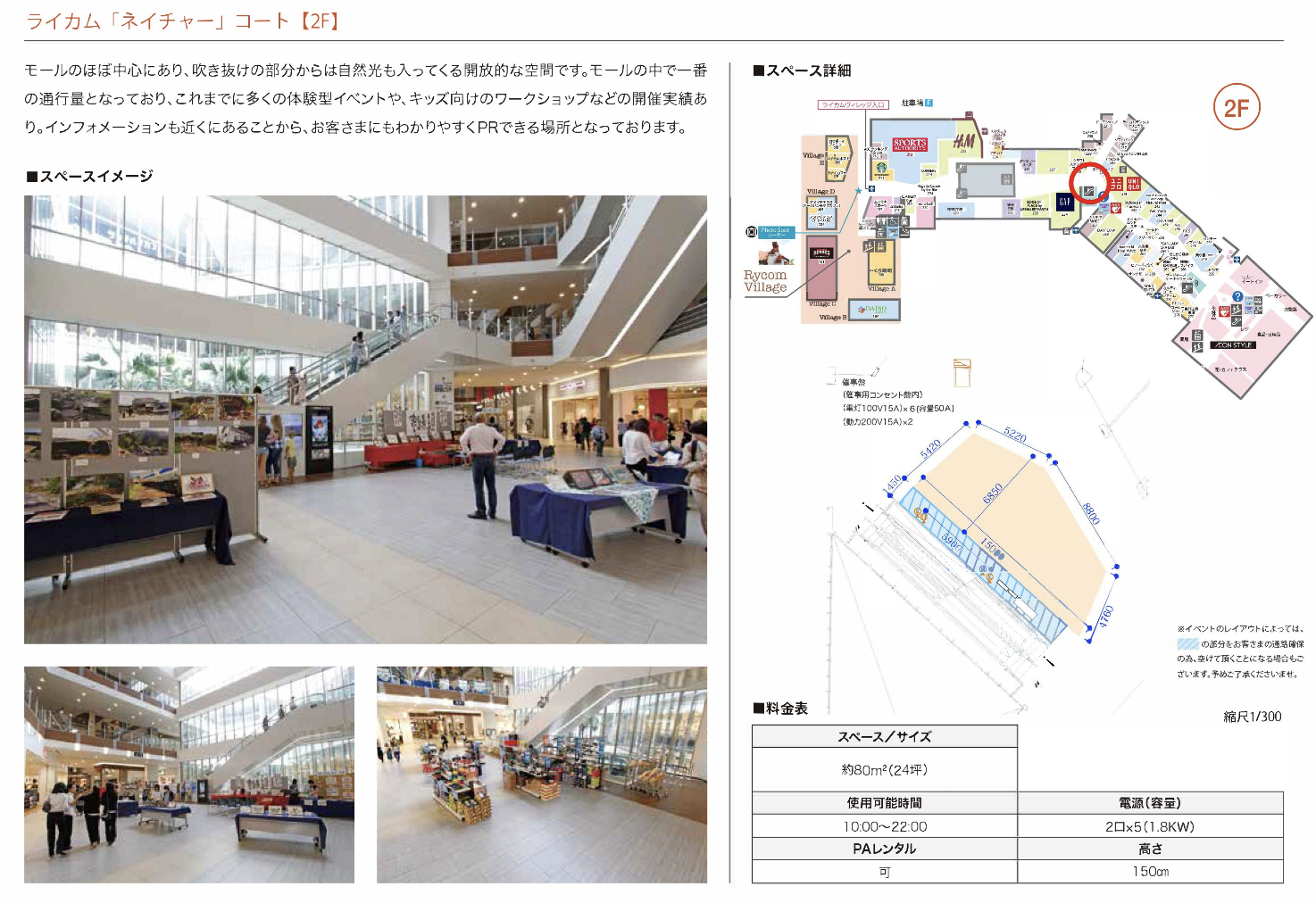 モールのほぼ中心にあり、吹き抜けの部分からは自然光も入ってくる開放的な空間です。モ ールの中で一番の通行量となっており、これまでに多くの体験型イベントや、キッズ向けのワークショップなどの開催実績あり。インフォメーションも近くにあることから、お客さまにもわかりやすくPRできる場所となっております。 面積: 24坪(80m²) 使用料: 【平日】220,000円(税抜)/日 【土日祝】385,000円(税抜)/日 【アプリプッシュ通知付】+50,000円(税抜)/日 2026年4月1日から下記の通り料金を改定いたします。 【平日】250,000円(税抜)/日 【土日祝】400,000円(税抜)/日 特徴: ・大スペース ・電源あり(100V) ・最大使用電力(1500W)