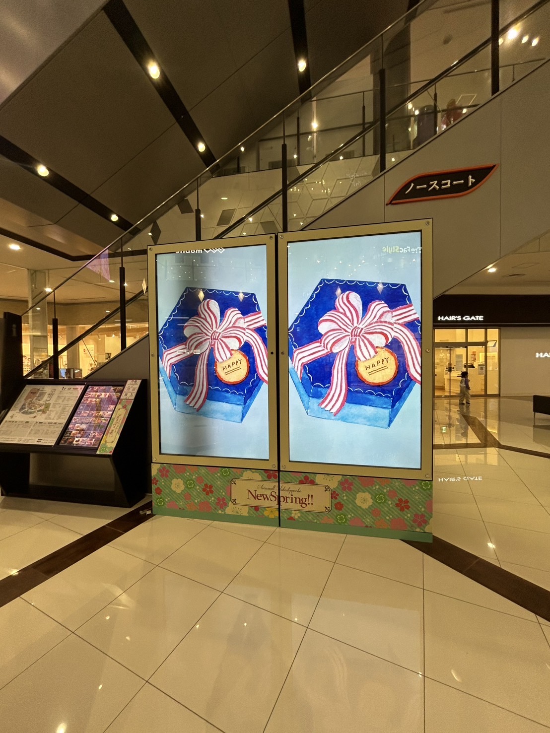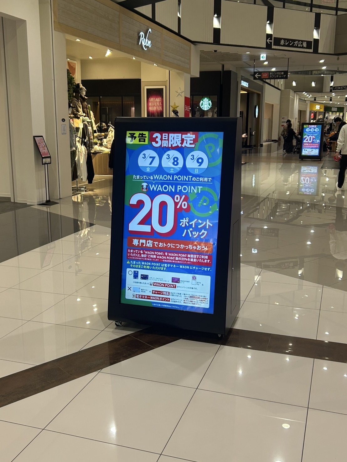 お客さまが一番通行する共用部に設置しており、最も目に付く場所です。 静止画に加え、動画も配信でき、視覚と聴覚でお客さまに宣伝できます。 【縦型のデジタルサイネージ】 掲出箇所 18箇所(大型2台・小型16台)全館合計18台 掲出料(2週間) 全箇所 100,000円 (4週間) 全箇所 160,000円 ※制作費・施工費は別途費用がかかります。 【解像度】 ① 縦型 縦1920×横1080px ②横型 縦1080×1920px ③縦型分割※動画+静止画1枚 横1080px×縦1313px ④縦型分割※動画+静止画2枚 横1080px×縦657px ⑤横型※店舗情報あり 横1920px×縦880px ⑥縦型※店舗情報あり 横1082px×1700px ⑦縦型分割※動画+静止画+店舗情報 横1080px×縦1090px ⑧層間フル 横1920px×縦540px 【カラー形式】 静止画 RGBカラーモデル 動画 ビットカラー24bit 【フェイル形式】 静止画 jpg/jpeg/png/pdf 動画 mp4/mov/wmv(Windows Media Video9) 【データ容量】制限しない 【動画関連】 ビットレート 10mbps程度(自動調整) フレームレート 29.97fps(自動調整) オーディオサンプルレート 音声出力はありません オーディオビットレート 音声出力はありません 【再生時間】 静止画:10秒以上 動画:10~90秒 【注意事項】 ※解像度や各比率が異なるデータは、黒または同系色の余白が表示されますのでご了承ください ※入稿コンテンツの拡張子を変更しないでください ※静止画にトンボ表記がありこれを削除する場合、あるいは動画の前後の黒画面(のりしろ)や、動画先頭の広告タイトル等をカットしたい場合は、入稿時にお申し付けください。 ※動画の音量は他のコンテンツに合わせて自動調整されます。また、端末ごとに音量設定が異なる場合がありますのでご了承ください。 ※画像データの開店等、軽微な調整はRCTで対応可能です。正規画像編集用ソフトを使用せず、Windows等のOS標準機能で画像回転等の調整を行ったデータは原則入稿しないようお願い致します。 ※全店合同セール・プロモーション展開時には使用できない場合がございます。 ※「放映希望多数の場合」 「法律・公序良俗に反するもの」 「広告審査に通らないもの」 は放映を制限させて頂く場合や、内容の修正を依頼させて頂く場合がございます。 ※静止画・動画に関わらず、秒数内で認識が可能な範囲の情報量で制作下さい。 人間が認識可能な文字数は1秒につき4文字と言われております。静止画の放映時間の15秒に 換算しますと60文字となります。 大幅に超過する場合は別素材にて制作下さい。