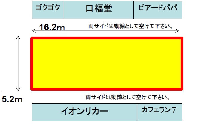 ①本サイトからお問い合わせください。 ②お問い合わせ内容について審査の上、担当者より使用可否をご連絡させていただきます。 ※使用可否について当社はその理由を主催者に対して返答する義務を負いません。 ※先着順ではございません。 ③ご担当者さまと現場打合せをさせていただきます。 企画内容をヒアリングさせていただき、その他、使用上の注意事項についてご説明いたします。 ※使用目的・内容によっては、使用許可を取り消す場合がございますのでご了承ください。 ④「確認書」「図面・レイアウト」をご提出ください。【イベント実施日の1ヶ月前まで】 ※以後のキャンセルについては1ヶ月前よりキャンセル料が発生いたします。 ⑤ 当社指定の方法でご入金をお願いします。【イベント実施日の7日前まで】 ⑥ 必要書類、申請書をご提出ください。【イベント実施日の1ヶ月前まで】 本施設での出店・広告出稿にかかわる契約はイオンリテール株式会社と締結いただきます。