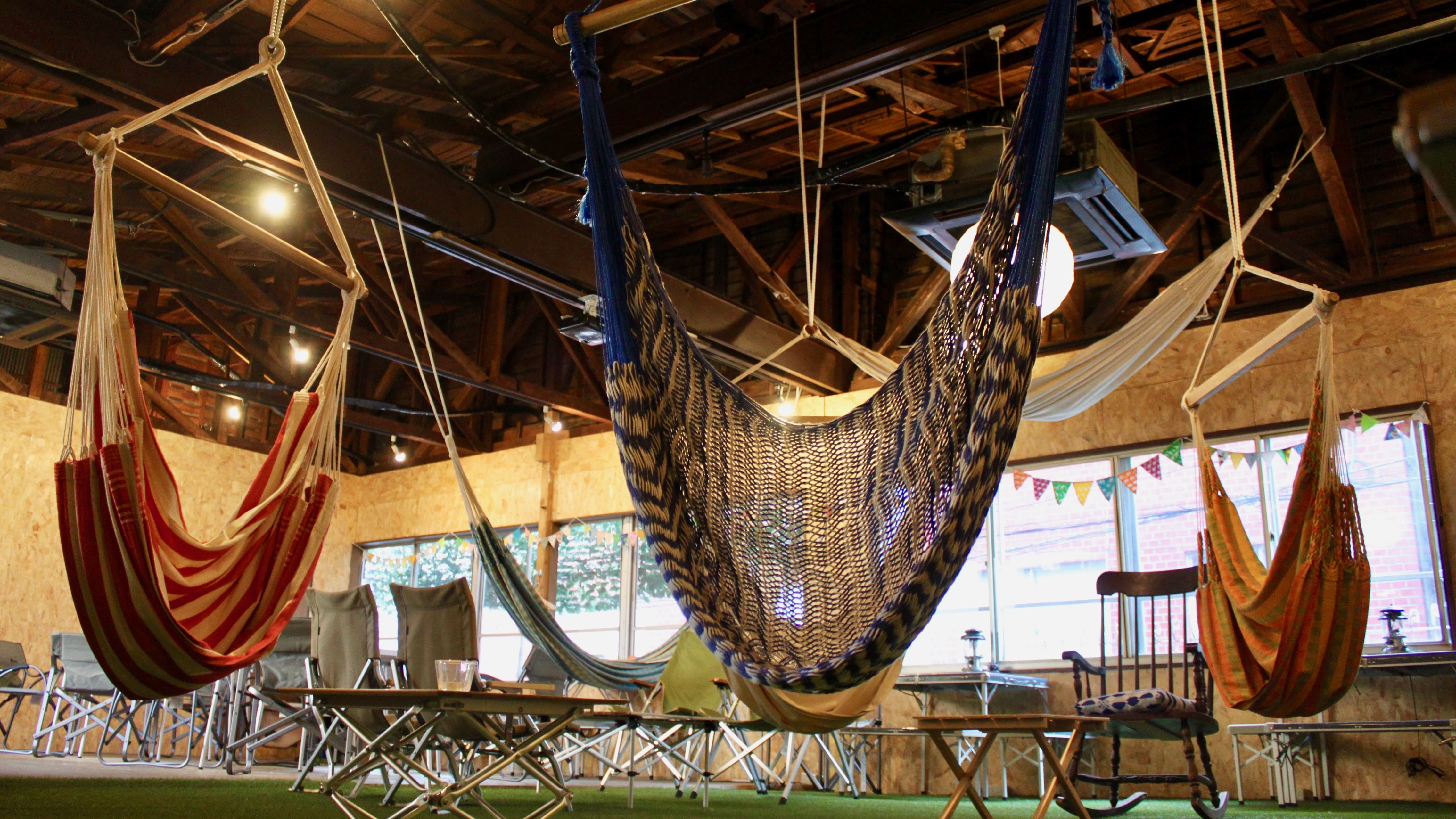 人気のエリア、吉祥寺からもすごく近いJR中央線・総武線三鷹駅から徒歩7分にあるカフェ内のイベントスペースです。普段はハンモックカフェとして営業しておりますので、ハンモック、グラスやお皿類はもちろん、Wi-Fiや大型スクリーンなど設備面も充実しております!大型のテントも店内に設置してございます!店内にはハンモックや芝生があり、外にいるかの様な開放的な空間になっております。 販売や、展示場、イベントスペースとしてなど、多用途でご利用いただけます。お気軽にご相談ください。 *その他* ご利用人数の目安 着席:最大40名ほど スタンディング:最大70名ほど 10名様以下の少人数での集まりにもお使いいただけます。