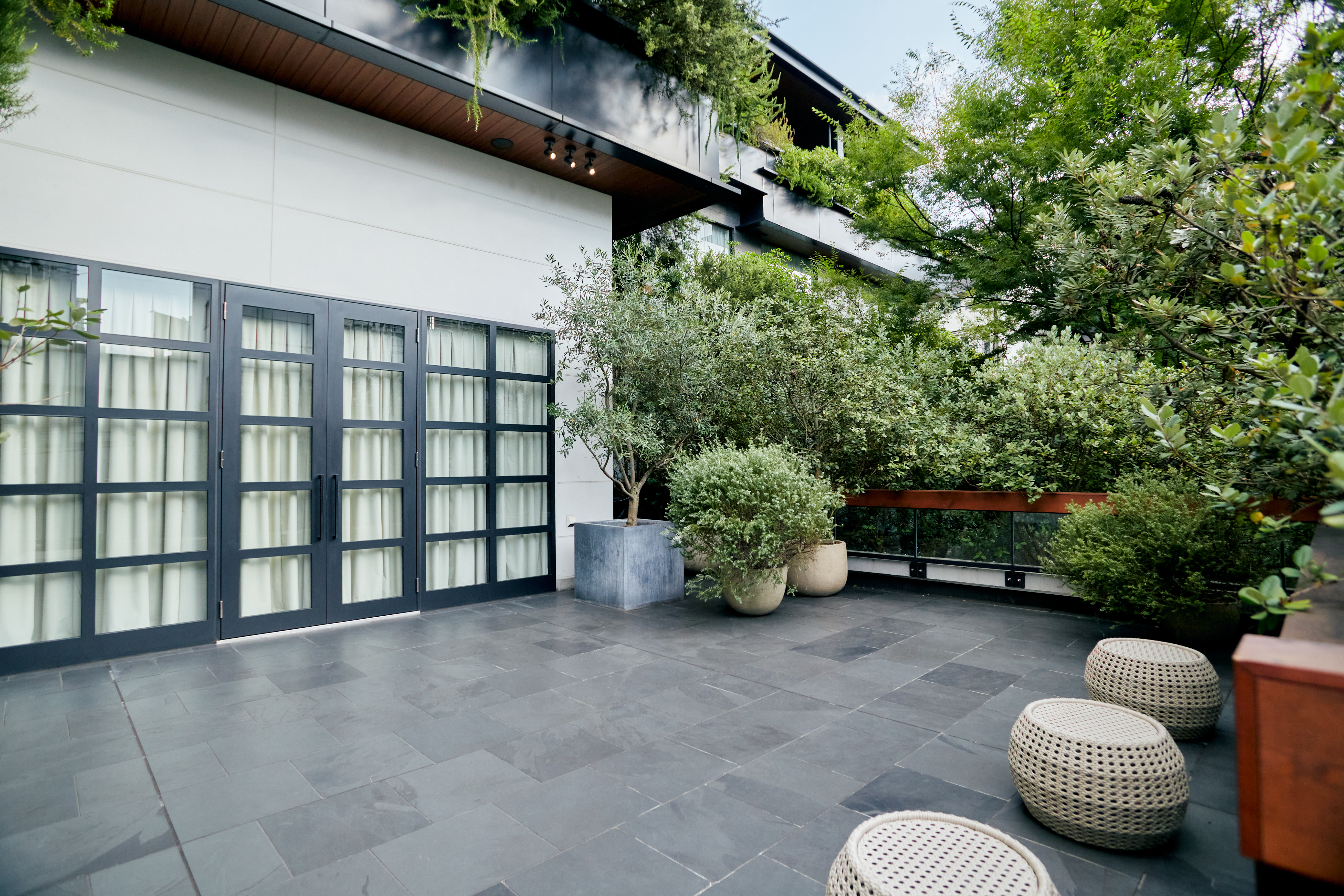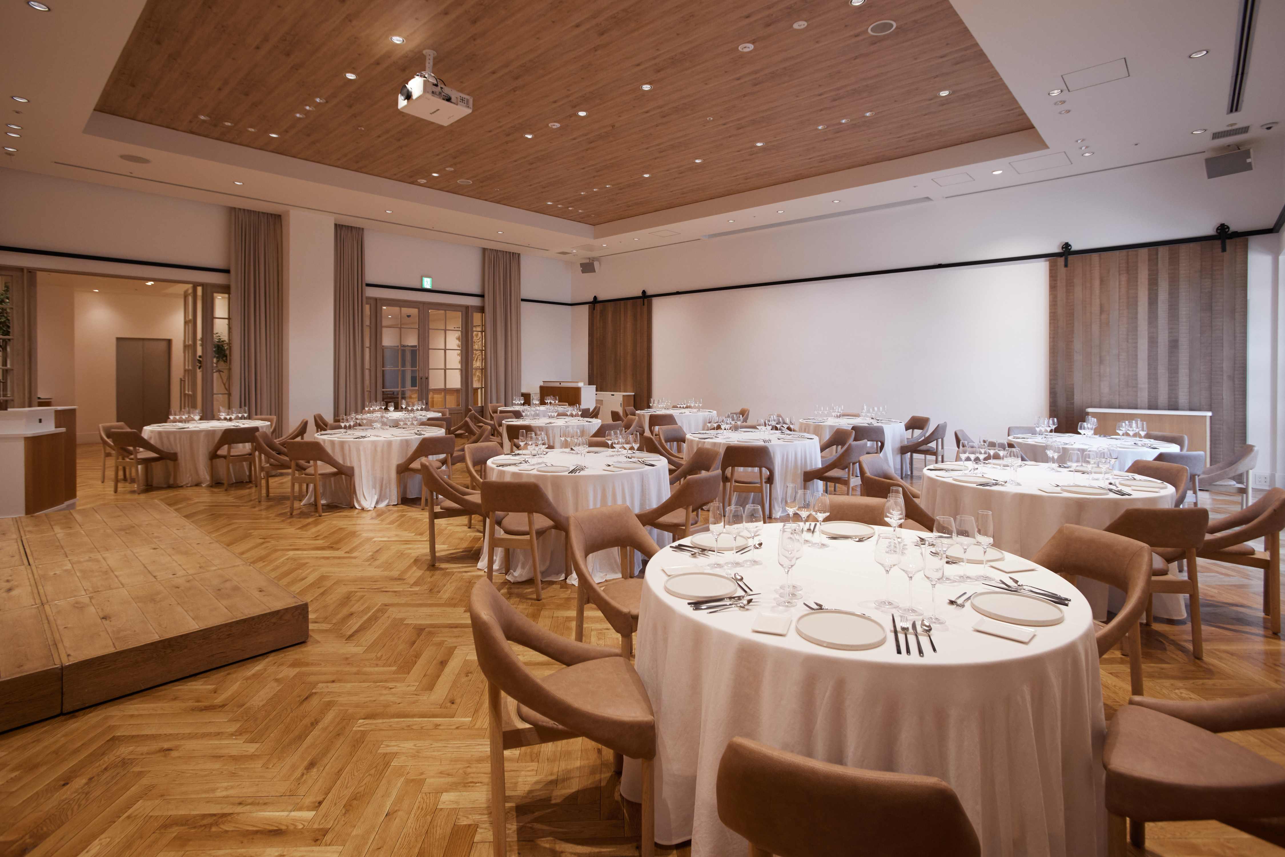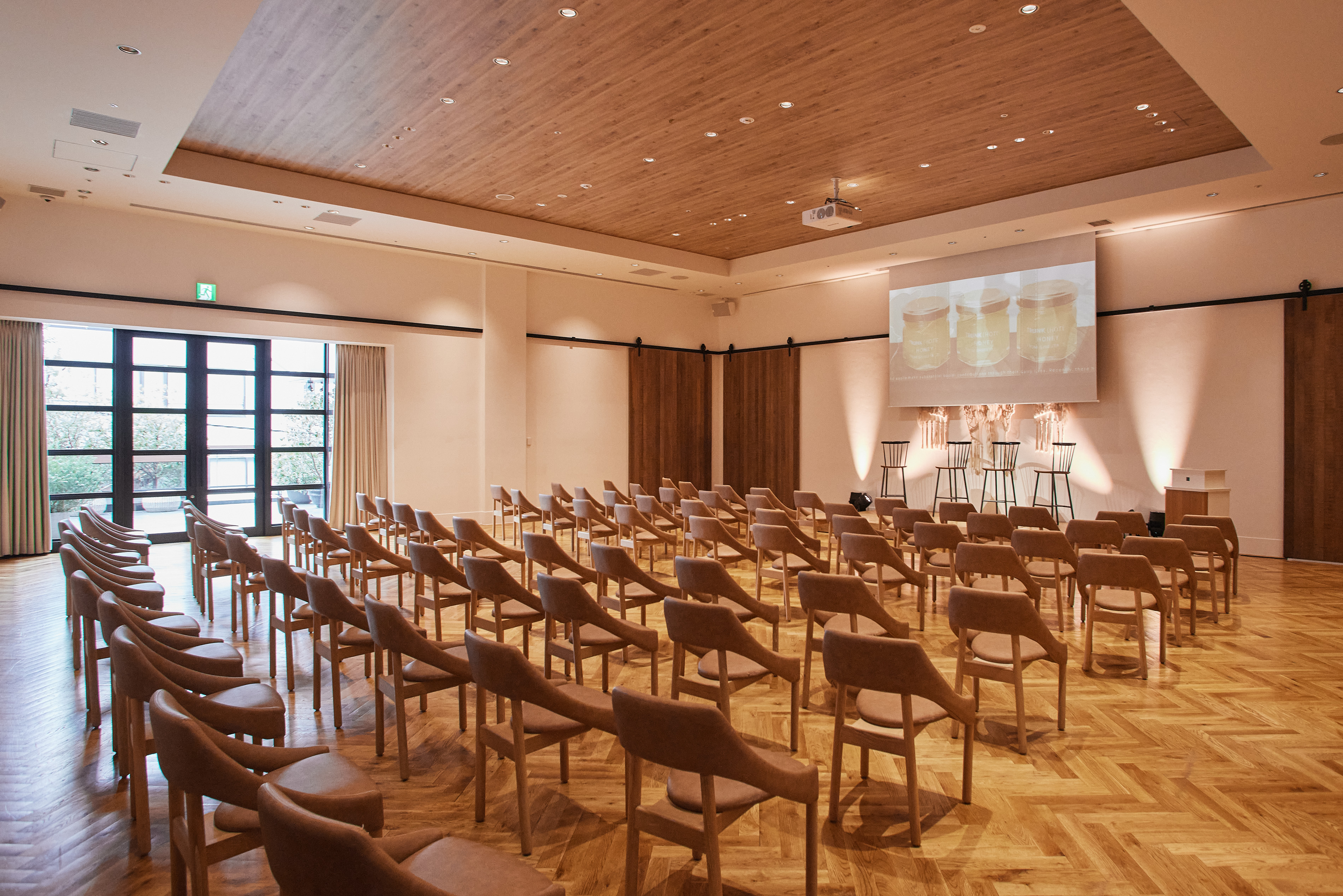 渋谷・原宿・表参道の中心、神宮前に位置する TRUNK(HOTEL) CAT STREET。ヒト・モノ・コトが出会い、新たな価値が生まれる場所として、宿泊、レストランやバーでの食事、ラウンジでの打合せ、そしてバンケットでのイベントなど、国内外から多様な目的で人々が集まります。 TRUNK(HOTEL) CAT STREETのバンケットイベントは、ただの会場提供にとどまらず、ブランドの世界観を発信できること、ホテルならではのホスピタリティと、一体感のある空間づくりができることが大きな強みです。 会場演出のスペシャリストが企画からデザイン・演出までワンストップ提案でサポートし、4会場のうち、複数会場をご利用される際には、同一コンセプトで統一することで、ブランドメッセージを一貫して体現することが可能です。 カンファレンスや表彰式、商品発表会、ネットワーキングなど、大切なシーンを記憶に残る特別な体験として実現します。 この土地の歴史(穏田時代の忍者が住み蔵がたくさんあった)時代の「蔵」からのインスピレーションをうけ、鉄(壁の滑車)、瓦(テラスに瓦色タイル)、木の素材(床・扉・家具)で作られたバンケットデザイン。ホワイエのライトには江戸切子を採用。和漆喰風の真っ白い白壁が独特の存在感を放ち、木の優しい色と素材がどんな装飾も映え女性なら誰もが憧れる空間に仕上げている。