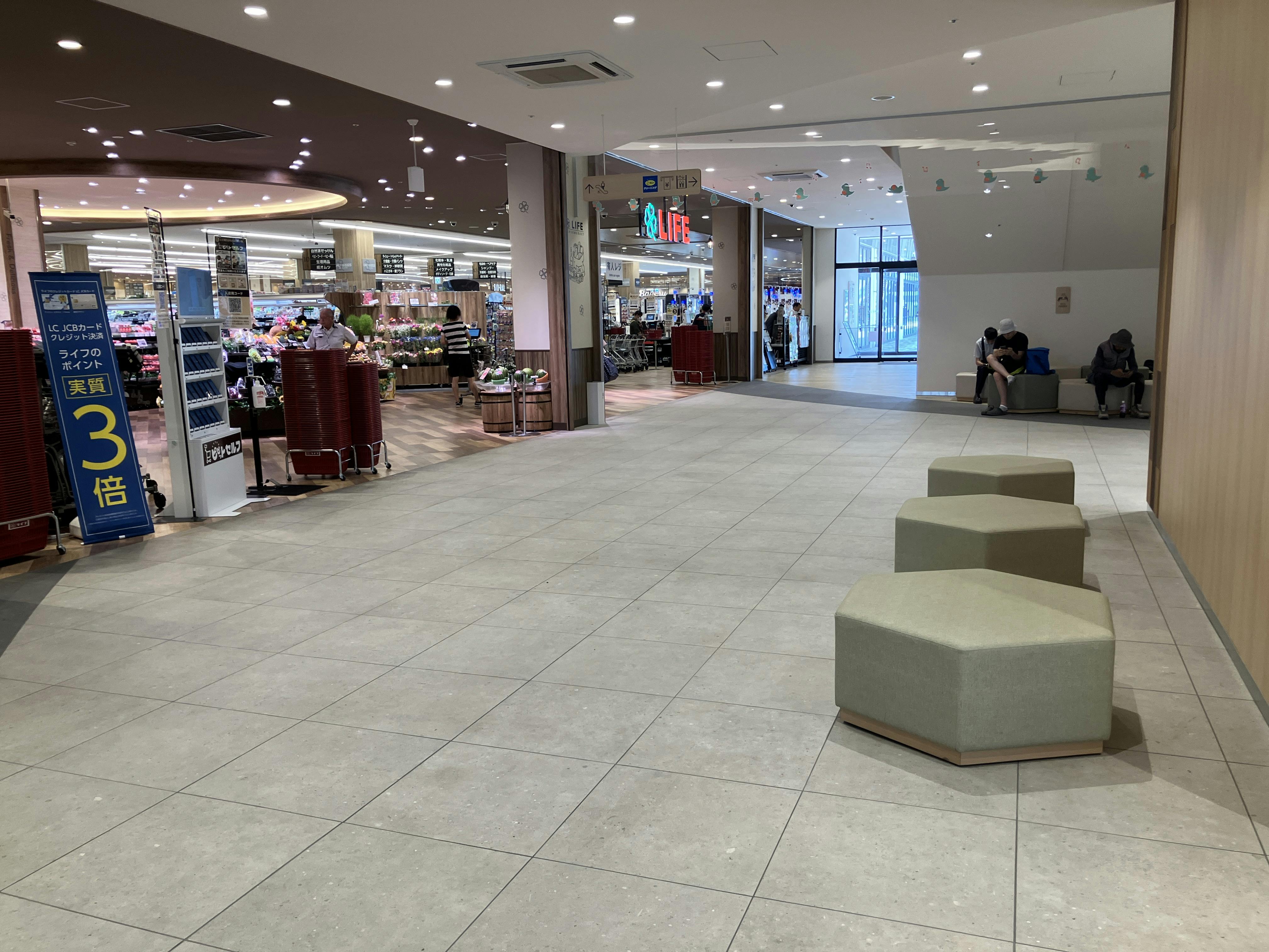 1階共用部、エスカレーター下に位置するイベントスペースです。スーパーマーケットをご利用のお客様への効果的なアプローチが可能です。物販・食物販・販促プロモーションなど、さまざまな用途に最適なスペースとなっております。ご利用やご相談は、ぜひお気軽にお問い合わせください。