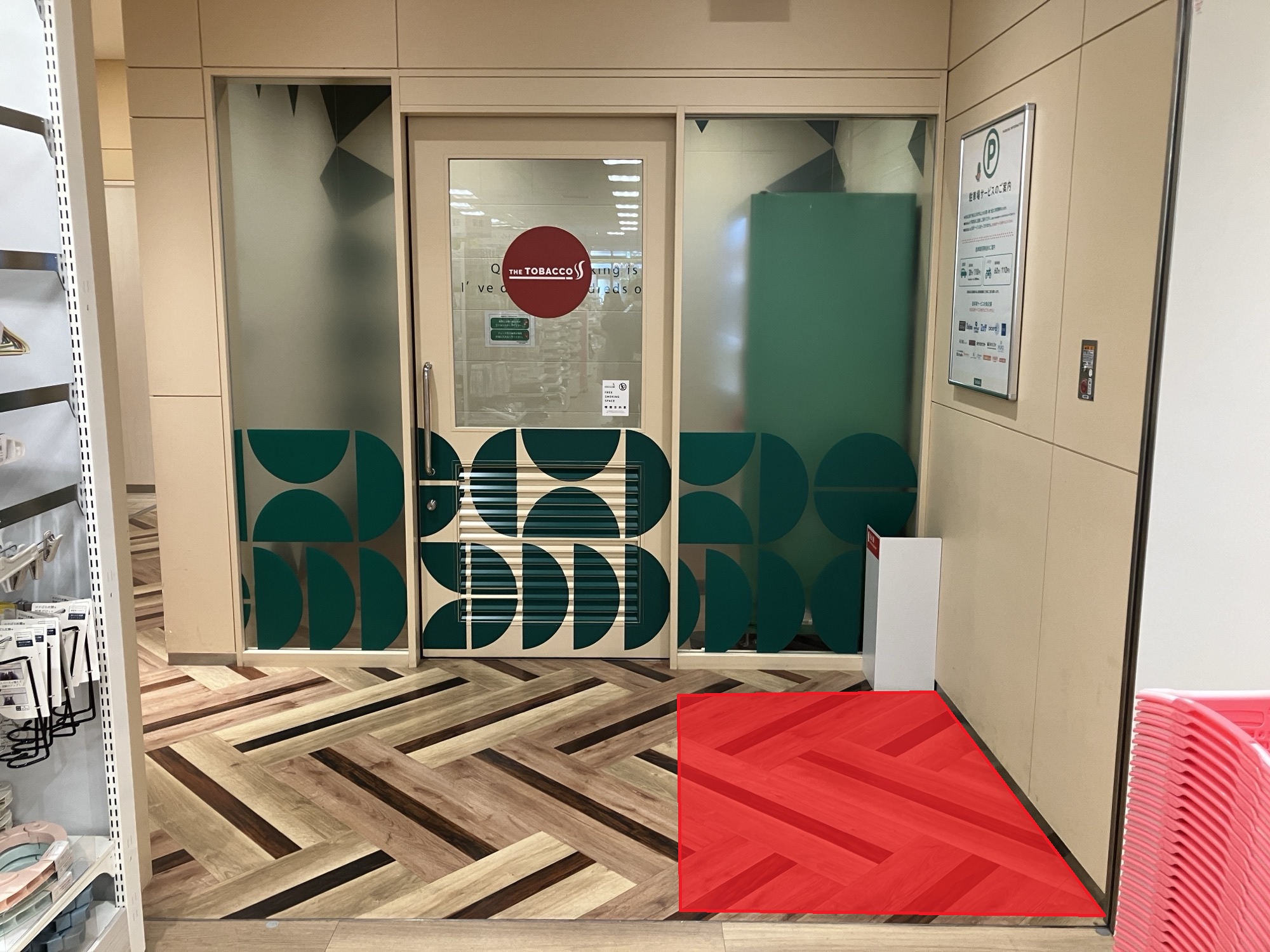 3階喫煙所前(セリア奥)に位置するイベントスペースです。電子タバコ関連商品の販促やプロモーションに最適な場所です。ご利用やご相談は、ぜひお気軽にお問い合わせください。