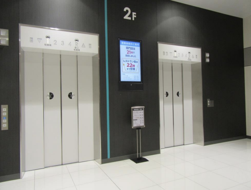 エレベーターメディアは他層階や駐車場を利用されるお客さまが待ち時間の際に注目される媒体です。 お客さまが立ち止まって見る媒体として高い視認率が期待できます。 告知面サイズも大きい為、迫力のある展開が可能です。 各階 4基(1F ~RF)(1F・RFは駐車場) 掲出料(2週間) 1基 62,500 円 掲出料(1ヶ月) 1基 100,000円 【設置・掲出場所】 モール館内のエレベーター扉を対象に掲出を行います。 また、エレベーター扉は3面・4面の場合がありますので、現地調査時に確認してください。 【仕様・素材】 サイズ:各モールによって異なります。 ※エレベーター広告は4分割(又は3分割)のシートの貼付けとなりますが、面によってサイズが異なる 場合がありますので、現地調査時に確認してください。 素材:塩化ビニールシート(再剥離)・マットラミネート加工 【施工方法】 4分割(又は3分割)されたシートの貼付けのため、デザインのズレが発生してしまう恐れがあるので、 適宜確認を行いながら貼付けを行ってください。 【注意事項】 施工時:エレベーターには、注意マークが貼付けされているため、各モールとの協議の上、 予め製作時にデザイン上にマークを入れる、などの対応を行ってください。 ※また、注意マークの上に貼付けを行う場合、注意マークを養生の上、施工を行ってください。 撤去時:エレベーター表面を傷を付けたり、糊残りがないように撤去を行ってください。 ※エレベーター広告は、メンテナンスは実施不要