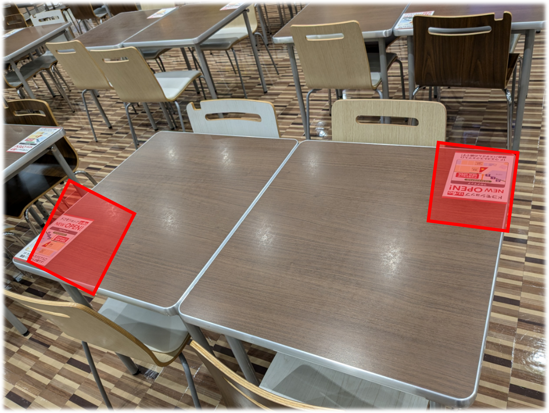 滞留時間の長いフードコートのテーブルをメディア化。 飲食や休憩をする場所なので、読ませる広告として活用できます。 【掲出料金】2週間/全420卓 400,000円(税抜) 【媒体サイズ】 A5サイズ以内 【仕様・素材】 塩ビシート(再剥離) ※マットラミネート加工 【製作枚数】 貼付け枚数+その2割を張替予備とする