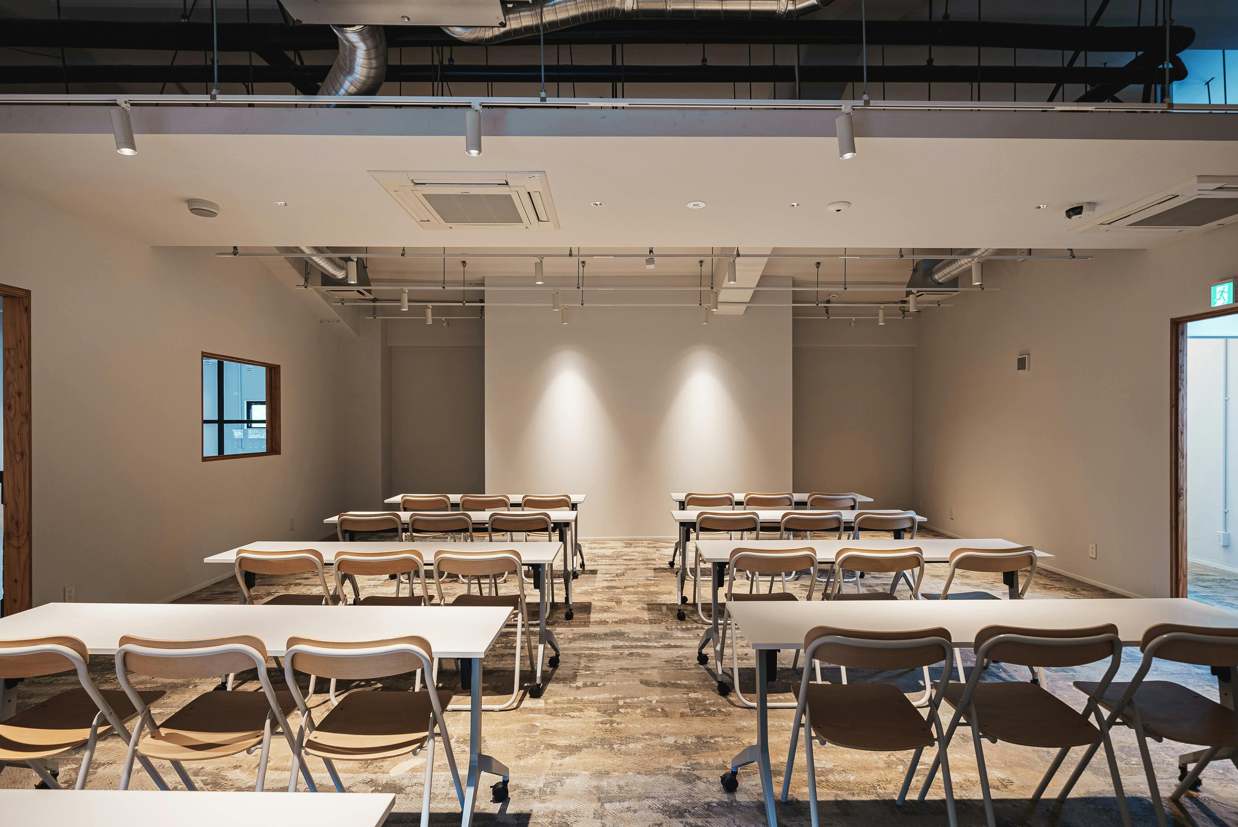 セミナーや勉強会、ワークショップなどにご利用いただけます。全27席あり、プロジェクターの無料貸出もございます。テーブル・椅子は収納することも可能なので、広いスペースを使ってマーケットなど開催することもできます。お気軽にお問い合わせ下さい。