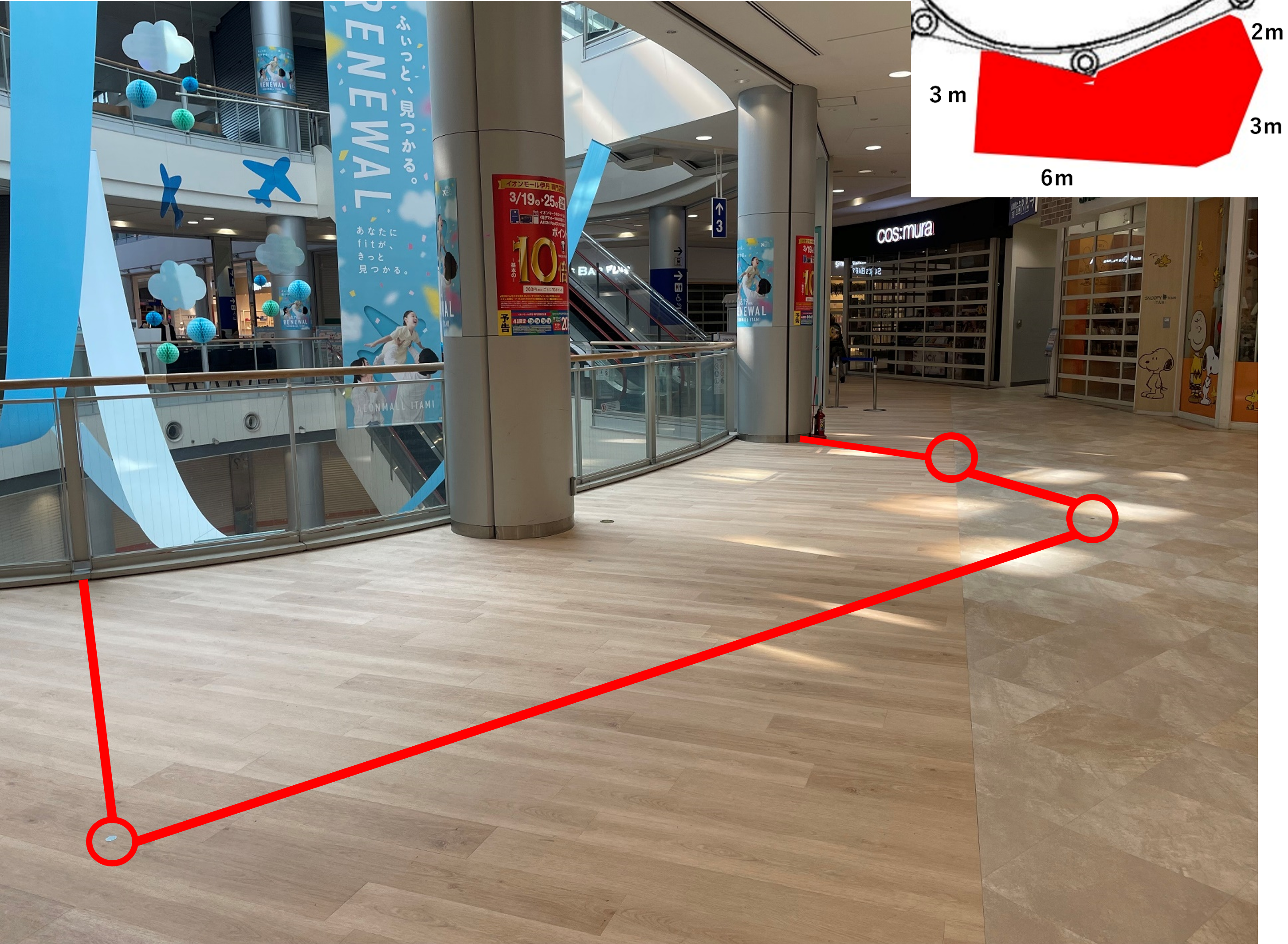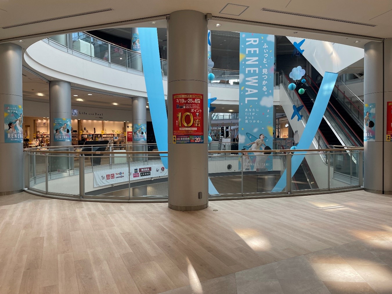 JR伊丹駅から直結の2階デッキ入口(メイン入口)からすぐで、AEON STYLEとの連結部分でもあるため、非常にお客さまの通りの多い魅力的なスペースです。