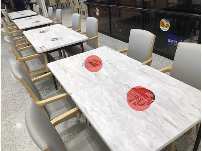 滞留時間の長いフードコート内のテーブルをメディア化。 お客さまが飲食や休憩をする場所なので読ませる広告としての活用ができます。 ※全店合同セール・プロモーション展開時には使用できない場合がございます。 媒体 :297mmφ 仕様・素材: 塩ビシート(再剥離)※マットラミネート加工 最大掲出数: 350枚 掲出箇所: 【風庭】3F フードフォレスト 掲出料(2週間) :全席 300,000円(税別) ※シール制作、設営・撤去は別途貴社負担となります。