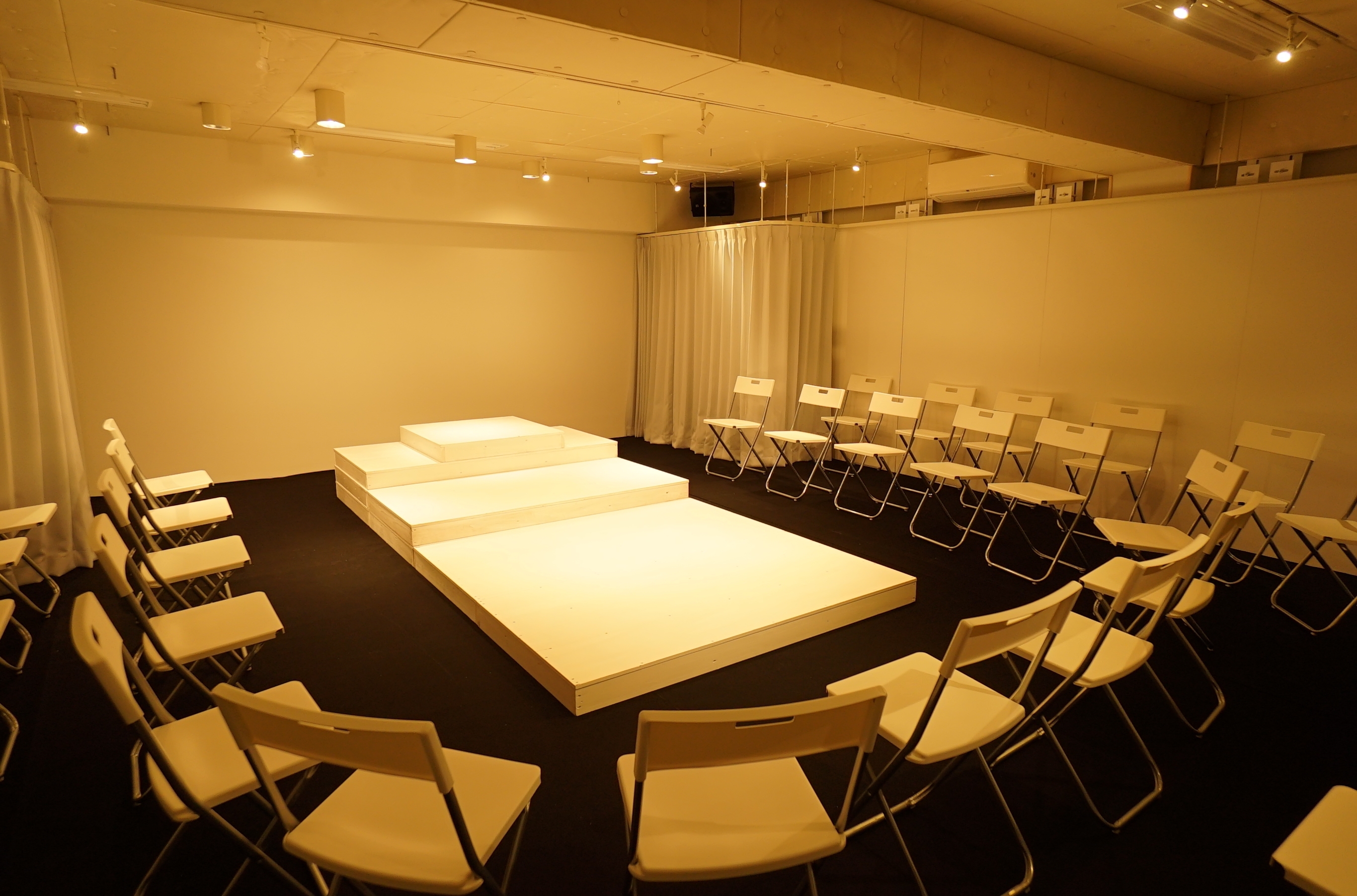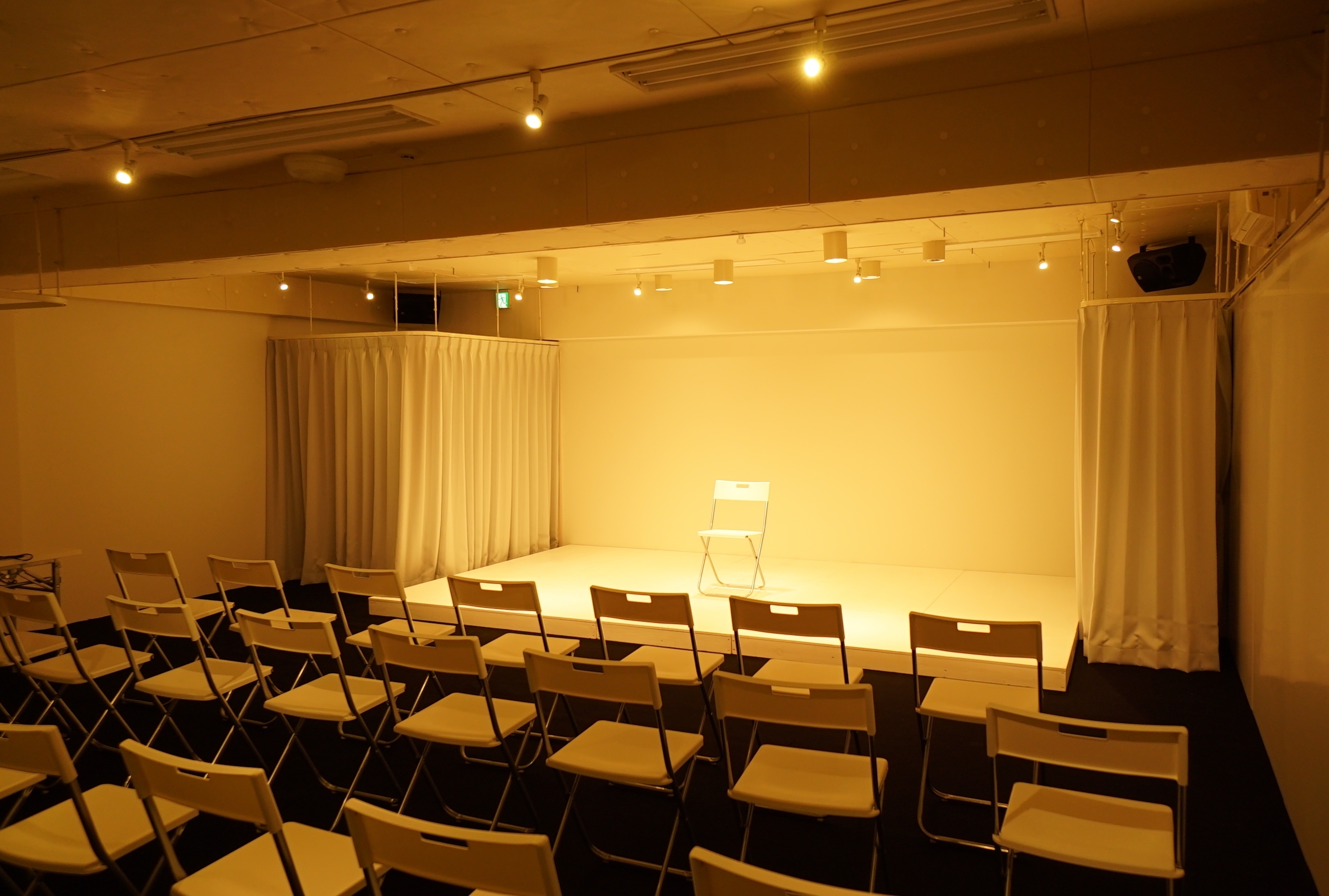 渋谷駅より徒歩4分、白を貴重とした創造性のある綺麗なスタジオスペース。完全防音個室、音響、照明機材が充実しているため、レッスンの他に「演劇稽古」や「アトリエ公演」、「ギャラリー」「展示会」など多岐にわたる利用が可能です。 渋谷駅より徒歩4分、白を貴重とした創造性のある綺麗なスタジオスペース。 完全防音個室、音響、照明機材が充実しているため、レッスンの他に「演劇稽古」や「アトリエ公演」、「ギャラリー」「展示会」など多岐にわたる利用が可能です。 音楽や照明を活用したこだわりの演出のプロモーションやアパレルの展示会などを開催してみませんか? 【収容人数】 ・40名 【設備・備品】 ・舞台袖スペース:2箇所*ステージ形態により異なります。 ・ラウンジ:*受付、バックヤード、更衣スペースとしてもご利用頂けます。 ・トイレ:*男女共用となります ・床:リノリウム ・照明:ベースライト(蛍光灯)/ スポットライト(調光可) スポットライト・ダウンライト *8系統(照明卓を利用する為電気料金が発生します) ・照明卓 ELATION STAGE SETTER8 *DMX照明コントローラー(16ch) ・アンプ CP4200 *4chパワーアンプ, 200W×4(8Ω) 《音響》 ・音響卓: BEHRINGER XENYX 1204USB *アナログミキサー,12IN,4マイク入力,USB ・CDプレーヤー TASCAM CD200 ・スピーカー CSP8 *4台 ・備品 ミラー *カーテンによりミラーを使用しないことも可能です ・長机 W1800×D600×H700×4台 ・イス 背もたれ付き×40脚、丸いす×10脚 有料備品 ヨガマット330円/1回 プロジェクター3300円/1回 マイク550円/1回 マイクスタンド550円/1回 キーボード550円/1回 下記アトリエ利用時のみ 平台 90㎝×180㎝ 6台 550円/1台 90㎝×60㎝ 3台 330円/1台 箱馬 8個 220円/1個