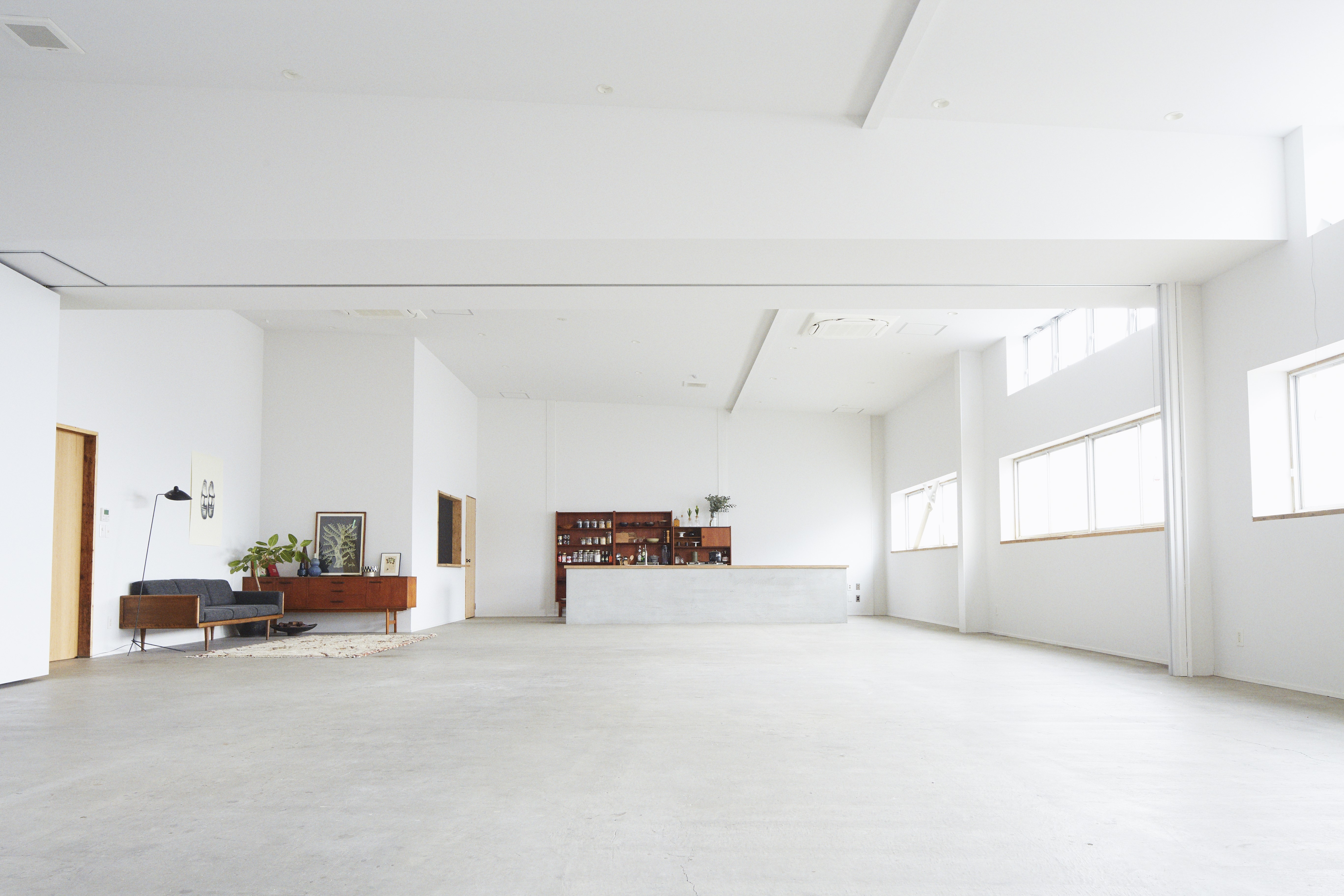 銘木倉庫をリノベーションした複合施設2Fのレンタルスペースです。天井高4.5mの白を基調としたシンプルな内観に自然光が差し込むフレキシブルなスペースです。スタジオはAとBの2つがあります。可動壁を開放すれば147㎡の広さとなり、スタジオAには常設キッチンがあり、配置されている北欧風の家具は、AB共用で、什器としてもお使いいただけ、展示会や撮影、イベントなど様々な用途でご利用いただけます。 新木場駅から徒歩5分、1階はカフェと古家具などを置いたおしゃれなショップ、その2Fに当スペースがあります。展示会や各種イベント、撮影はもちろん、常設キッチンを使用したワークショップなど幅広くご利用いただいております。階下のカフェからケータリングも可能です。内装工事も承っております。お気軽にお問い合わせください。 【利用料金(税込)】 176,000円/日 ※スタジオA+Bを展示会で、平日8時間ご利用いただいた場合の参考料金です。 ※企画内容により利用料金が変動致します。詳細はお問い合わせください。 *時間貸し* ・スタジオA(キッチン付) スチール撮影・展示会:16,500円/時 ムービー :18,700円/時 ・スタジオB スチール撮影・展示会:11,000円/時 ムービー:13,200円/時 ・スタジオA+B(キッチン付) スチール撮影・展示会:22,000円/時 ムービー:26,400円/時 ※4時間からご利用が可能です。 ※平日時間外の利用、土日祝の全時間帯は30%割増となります。 【利用時間】 8:00〜22:00 ※平日の時間外、土日祝も利用可能ですのでご相談ください。 ※搬入・搬出も利用時間に含みます。 *その他* ・面積 スタジオA:81.0㎡ スタジオB:66.1㎡