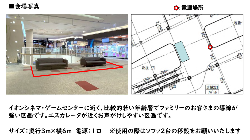 イベントスペースのご利用は、使用目的や企画内容による審査がございます。 事前に弊社担当者と打ち合わせ、審査に必要な資料等のご提出を必須としております。 内容および審査の結果によってイベントスペースのご利用をお断りする場合もございますので、予めご了承ください。 下記の使用目的・内容でのイベントスペースの使用は禁止といたします。 ・法律に違反するもの ・公序良俗に反する、またはわいせつなもの ・他人の信用または名誉・プライバシーを侵害するもの ・国内外の国家・民族等の尊厳を傷つける恐れのあるもの ・商標・著作権等を無断で使用するもの ・政治的または宗教的勧誘のあるもの ・当社の運営・利用を妨げるもの ・火気を使用するもの また、次の場合は使用許可を取り消す場合がございます。 ・使用目的・内容が禁止されているものに該当する場合 ・使用目的・内容等の変更に関して事前にお申し出のない場合 ・使用規定に違反のあった場合 ・使用上危険が予想されるとみなした場合 ・偽りの申請、その他不正手段により使用許可を受けた事実が明らかになった場合 ・使用の権利を譲渡、転貸した場合 ・その他管理上、支障または不適当と認められた場合 ・イベントスペースの使用目的に反した場合 上記がイベントスペースの使用中に発覚した場合、イベント等の実施中であっても即中断、退店いただき、今後一切の開催をお断りする場合がございますのでご了承ください。 なお、使用許可の取消、使用中止に伴う損害等についてイオンモール株式会社は一切の責任を負いません。 掲載しております賃料、諸条件につきましては一例です。イベントスペースは現況優先となります。 詳細は弊社担当者との打ち合わせ時にご確認ください。 本施設での出店・広告出稿にかかわる契約はイオンリテール株式会社と締結いただきます。