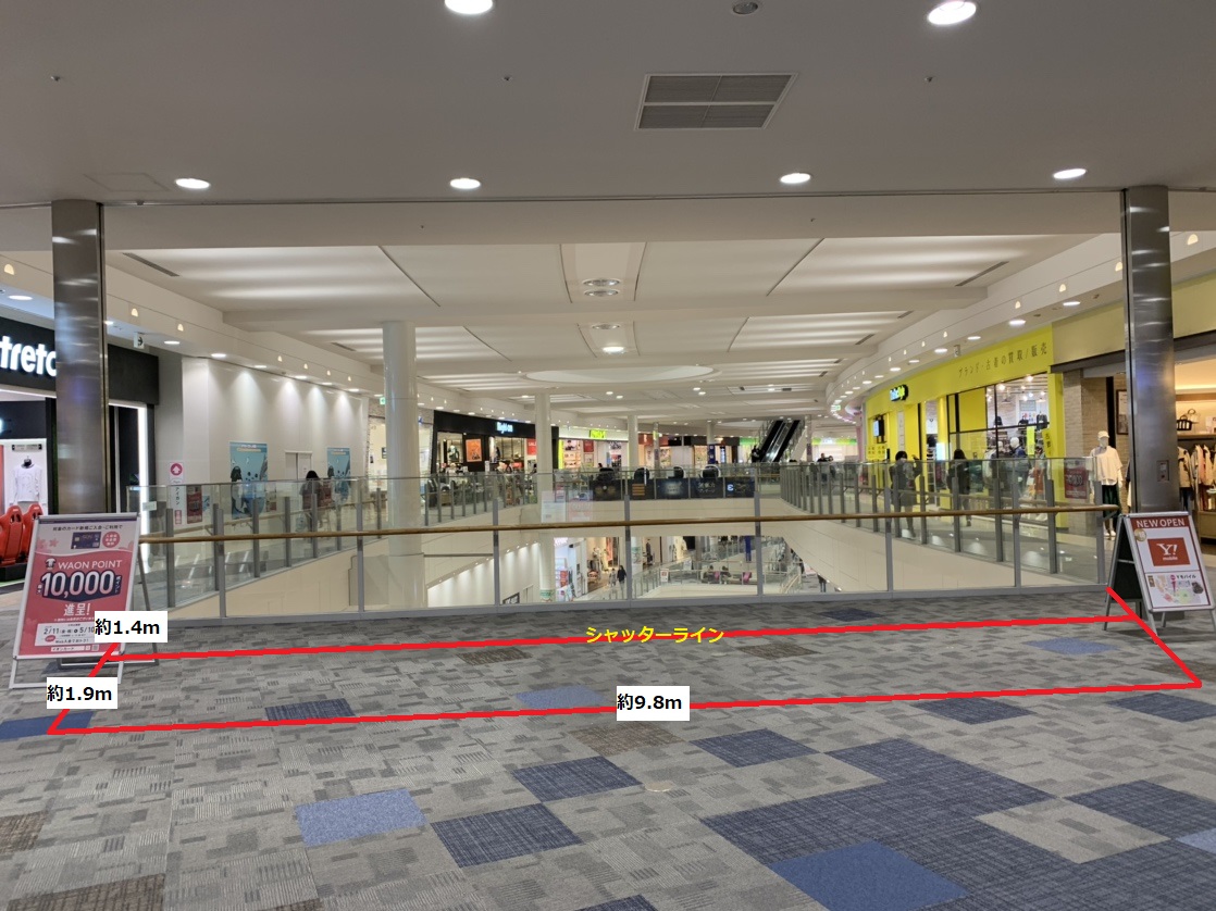 イベントスペースのご利用は、使用目的や企画内容による審査がございます。 事前に弊社担当者と打ち合わせ、審査に必要な資料等のご提出を必須としております。 内容および審査の結果によってイベントスペースのご利用をお断りする場合もございますので、予めご了承ください。 下記の使用目的・内容でのイベントスペースの使用は禁止といたします。 ・法律に違反するもの ・公序良俗に反する、またはわいせつなもの ・他人の信用または名誉・プライバシーを侵害するもの ・国内外の国家・民族等の尊厳を傷つける恐れのあるもの ・商標・著作権等を無断で使用するもの ・政治的または宗教的勧誘のあるもの ・当社の運営・利用を妨げるもの ・火気を使用するもの また、次の場合は使用許可を取り消す場合がございます。 ・使用目的・内容が禁止されているものに該当する場合 ・使用目的・内容等の変更に関して事前にお申し出のない場合 ・使用規定に違反のあった場合 ・使用上危険が予想されるとみなした場合 ・偽りの申請、その他不正手段により使用許可を受けた事実が明らかになった場合 ・使用の権利を譲渡、転貸した場合 ・その他管理上、支障または不適当と認められた場合 ・イベントスペースの使用目的に反した場合 上記がイベントスペースの使用中に発覚した場合、イベント等の実施中であっても即中断、退店いただき、今後一切の開催をお断りする場合がございますのでご了承ください。 なお、使用許可の取消、使用中止に伴う損害等についてイオンモール株式会社は一切の責任を負いません。 掲載しております賃料、諸条件につきましては一例です。イベントスペースは現況優先となります。 詳細は弊社担当者との打ち合わせ時にご確認ください。