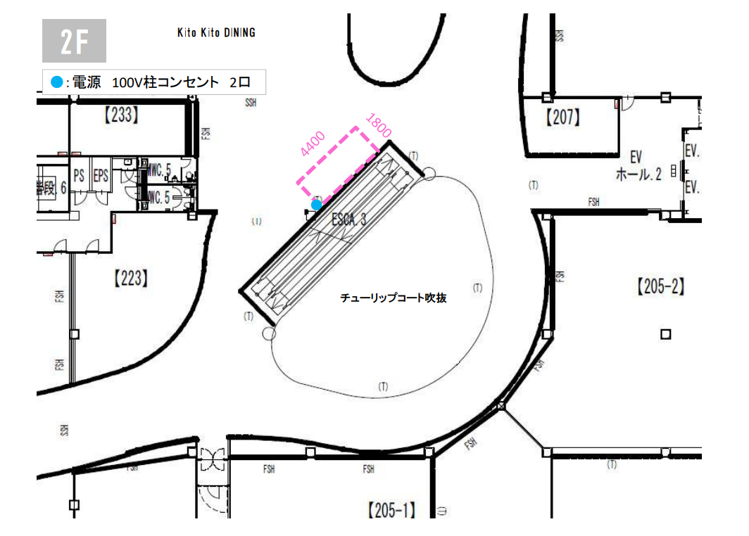 2Fの中央キトキトダイニング(フードコート)前に位置し、通行客が非常に多いです。