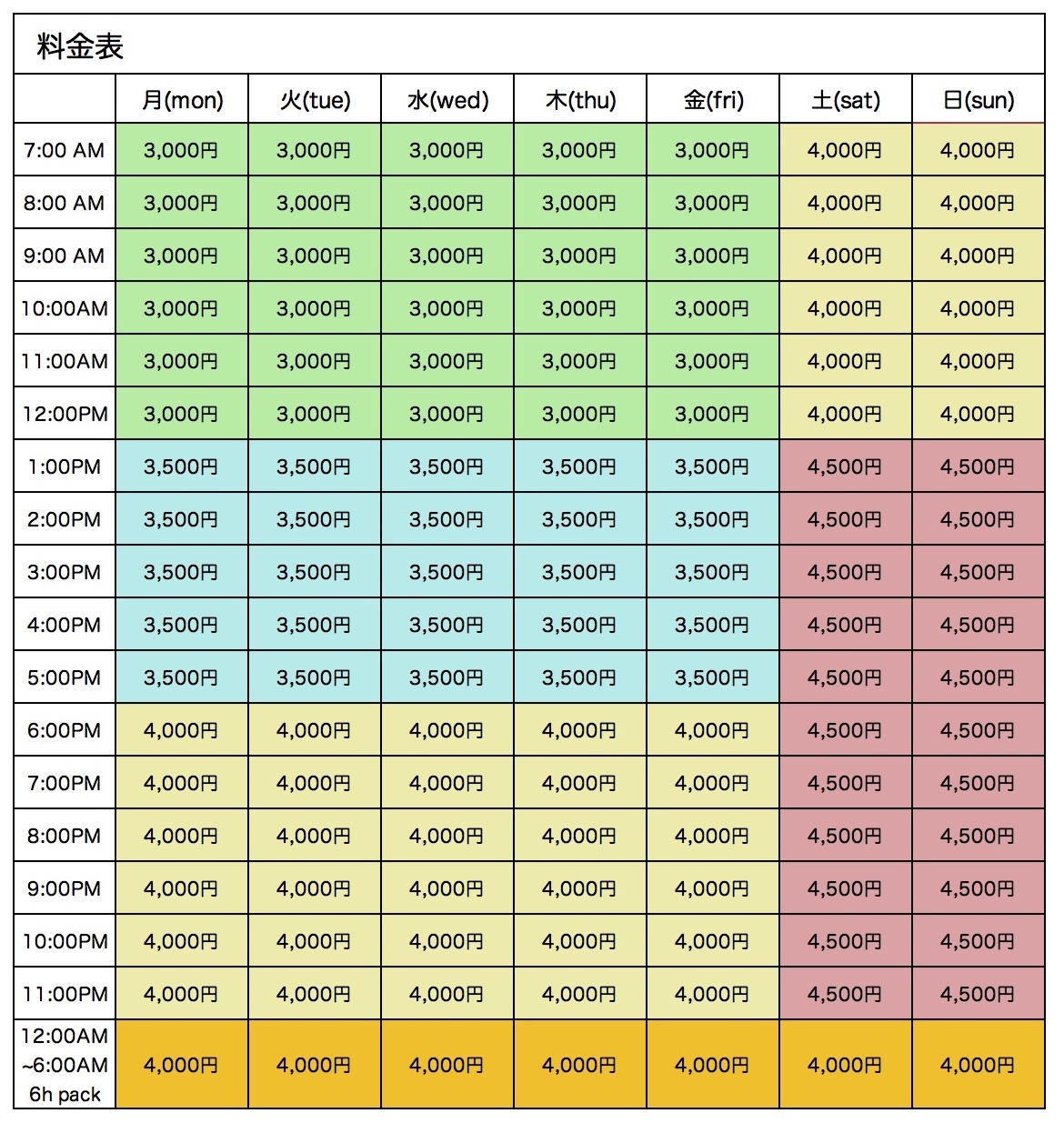 | 利用可能時間 | 00:00〜23:59 ※準備時間を含めた、スペースを利用できる時間です |