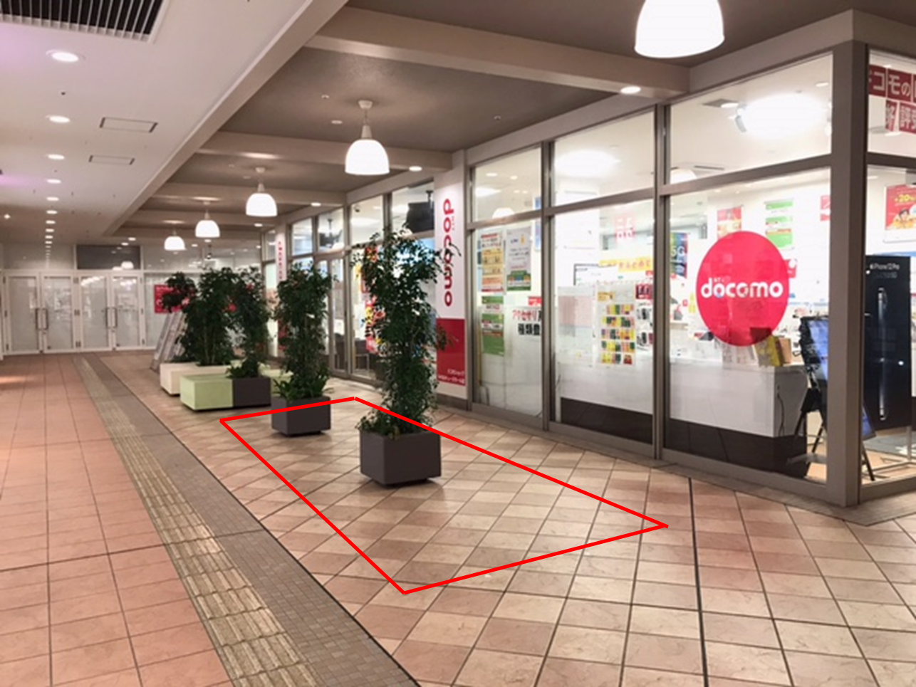 詳細は、以下URLより、「イベントスペース貸出案内」をご確認ください。 https://qs-mall.jp/minoh/eventspace ⑦EAST3-2F ドコモ前スペースは、駐車場から降りてくるエスカレーター近くのスペースです。 屋内の為、物販催事やワークショップなど、多様なニーズに対応可。壁のないスペースの為、レイアウト等要相談